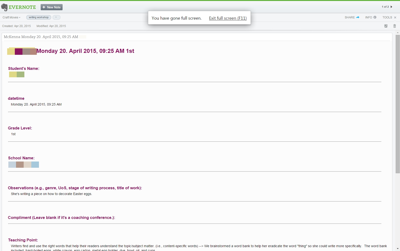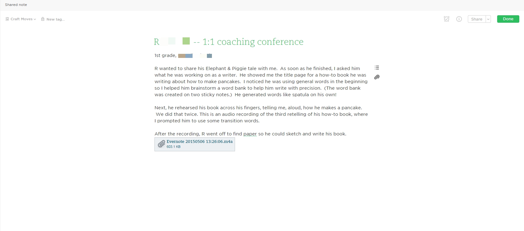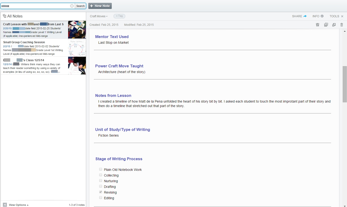 NOTE TO COACHES OR CONSULTANTS: Evernote is a fabulous place to store your conferring notes since it syncs with your smartphone and computer. It cuts down on the amount of paper you will need to carry from classroom-to-classroom or between schools.