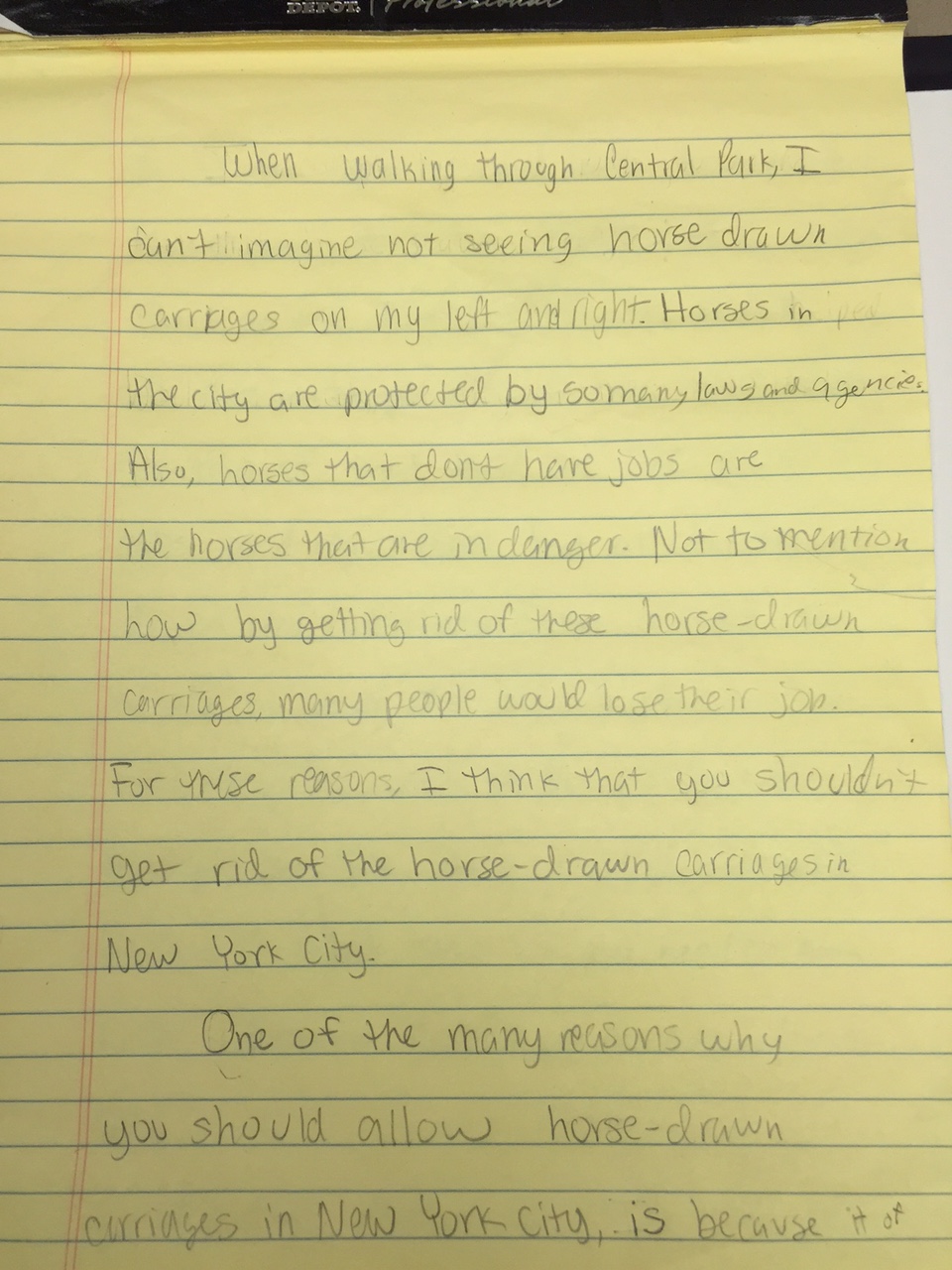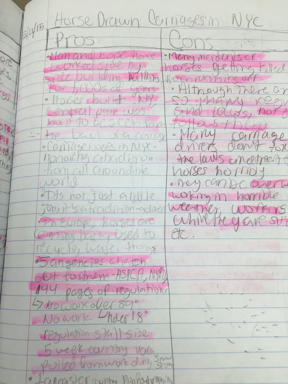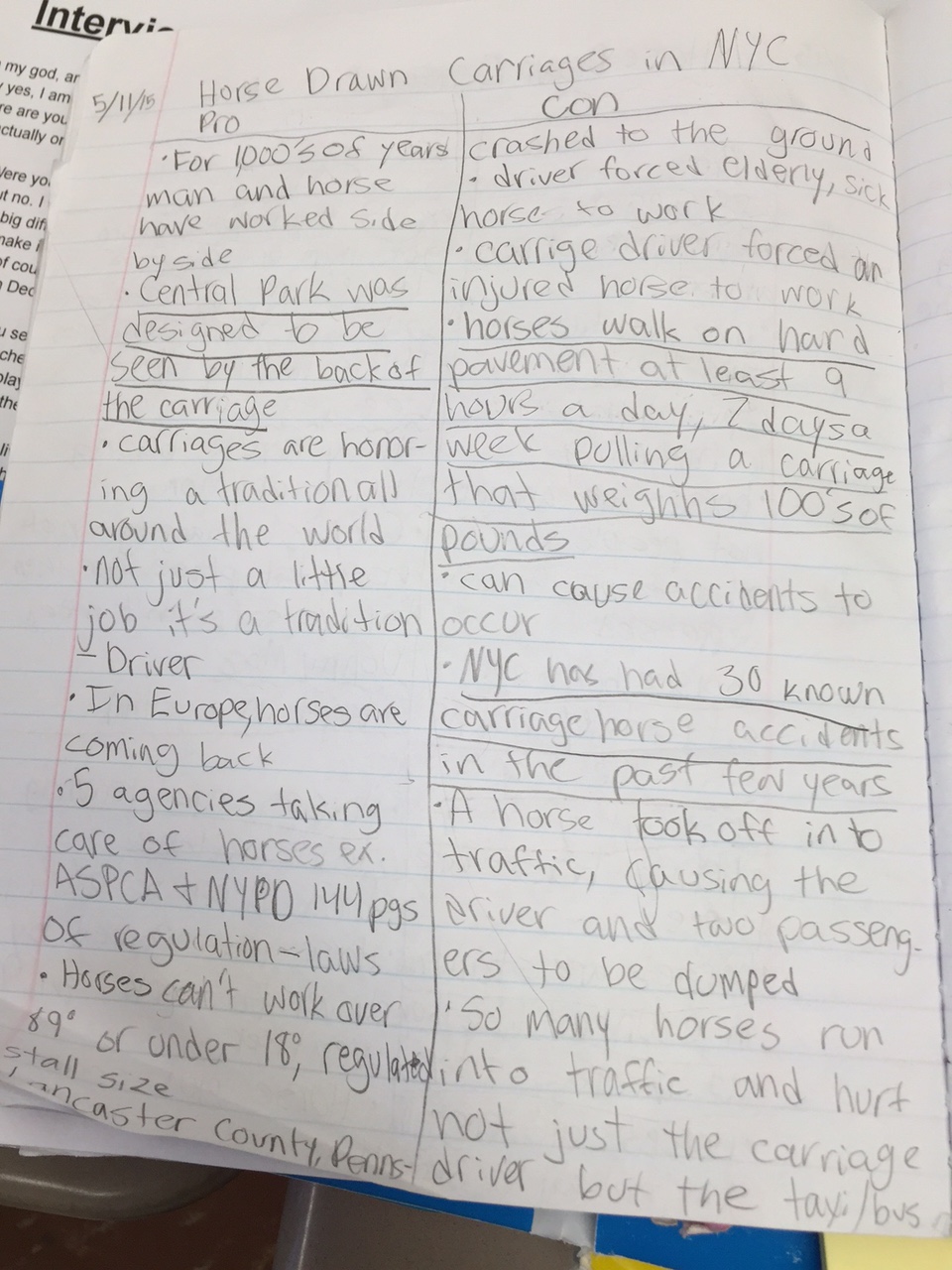 I pick something new each year, and stay away from the type of persuasive writing topics that my kids have been over exposed to in their years of test prep: uniforms, longer school years, etc. This year I picked a topic I had been interested in myself: New York City Mayor Bill de Blasio’s bid to ban horse-drawn carriages in the city. I have also found that any topic having to do with animals is instantly engaging to kids – they feel invested in the topic, and that it has an authentic importance.