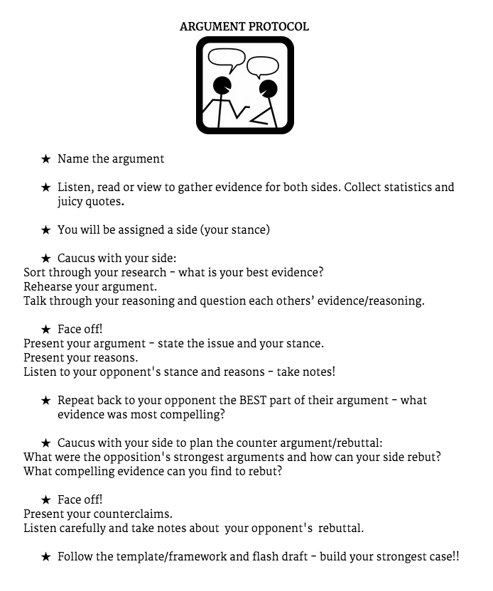 I use argument protocol often, and my students love it. Not only is the structure beneficial, the quickness of it ups the importance and excitement level for the students. I have had my 8th graders take notes on post its, which they can then move around to order their argument (or divide up into pro/con sides).