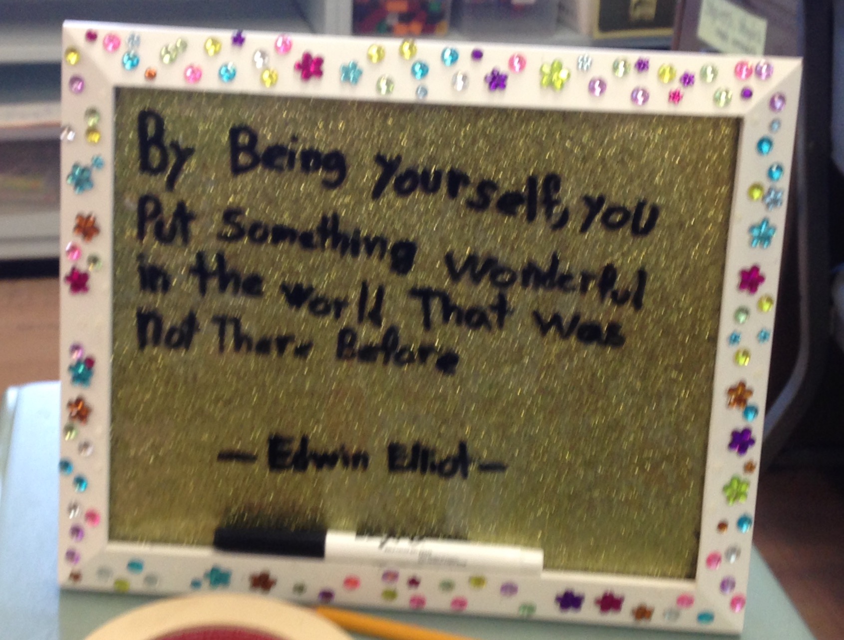 Thank you! You can write right on the glass- just need to use a dry erase marker. (I would choose low odor ones- they seem to work the best!) If you are on Twitter, check out @JoEllenMcCarthy and #glitterboards!