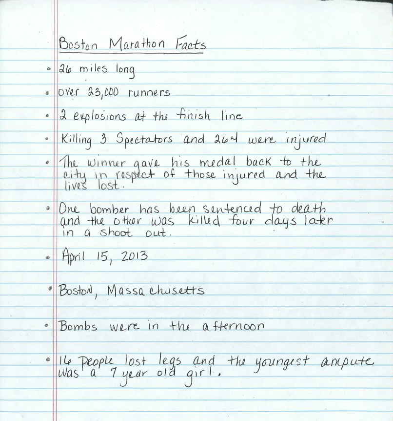 I am writing an information piece on the Boston Marathon bombing in 2013. I have all my facts gathered, and now I am trying to envision what story I might tell as I teach my readers about this tragic and sad event. I am thinking I might tell the story of a single runner. I could follow the runner from the starting point and through the race. We could experience the race with her – feet hitting the pavement, sweat dripping, breath heavy. She could hear the explosion and see people scattering in all directions. She watches, unhurt, as paramedics arrive. Later, she reads about the event on the front page of a newspaper.