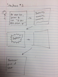 Or maybe I want to do snapshots of scenes instead. Scene one is in the early morning as volunteers set up the race route. Scene two is the runners arriving and stretching their muscles. Scene three is a family cheering their runner on from the sidelines during the race. Scene four is chaos, smoke, and injuries.