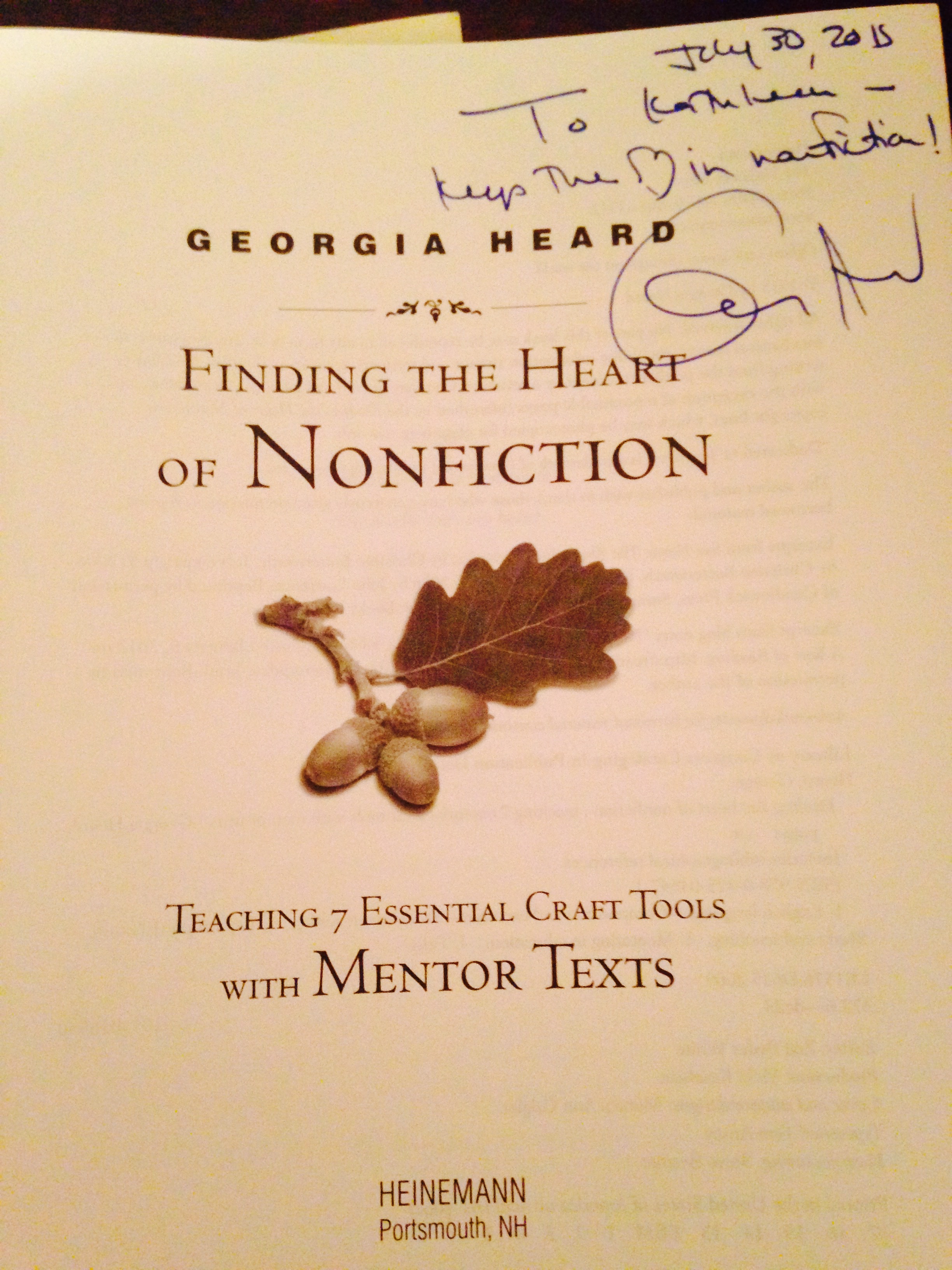 What a thorough and passionate piece about nonfiction writing. You have clearly decided to make this a priority and are giving your students lots of options for doing the same. I found my ENL students loved nonfiction precisely because it is concrete and easier for them to understand. It was so helpful for them to have mentor texts to use when they were writing their own nonfiction pieces. I, too, love Georgia Heard’s work. How lucky you are to have met and worked with her!