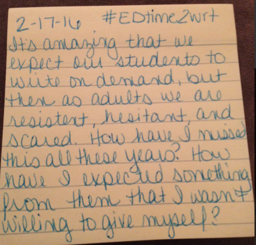 - Terrie DeHaan spoke about how writing post-its each day for #EDtime2wrt has made her more disciplined and her student teacher has started writing too! Terrie reflected on the collaboration and passion that is evident in all the teachers sharing and discussing the idea of educators writing.