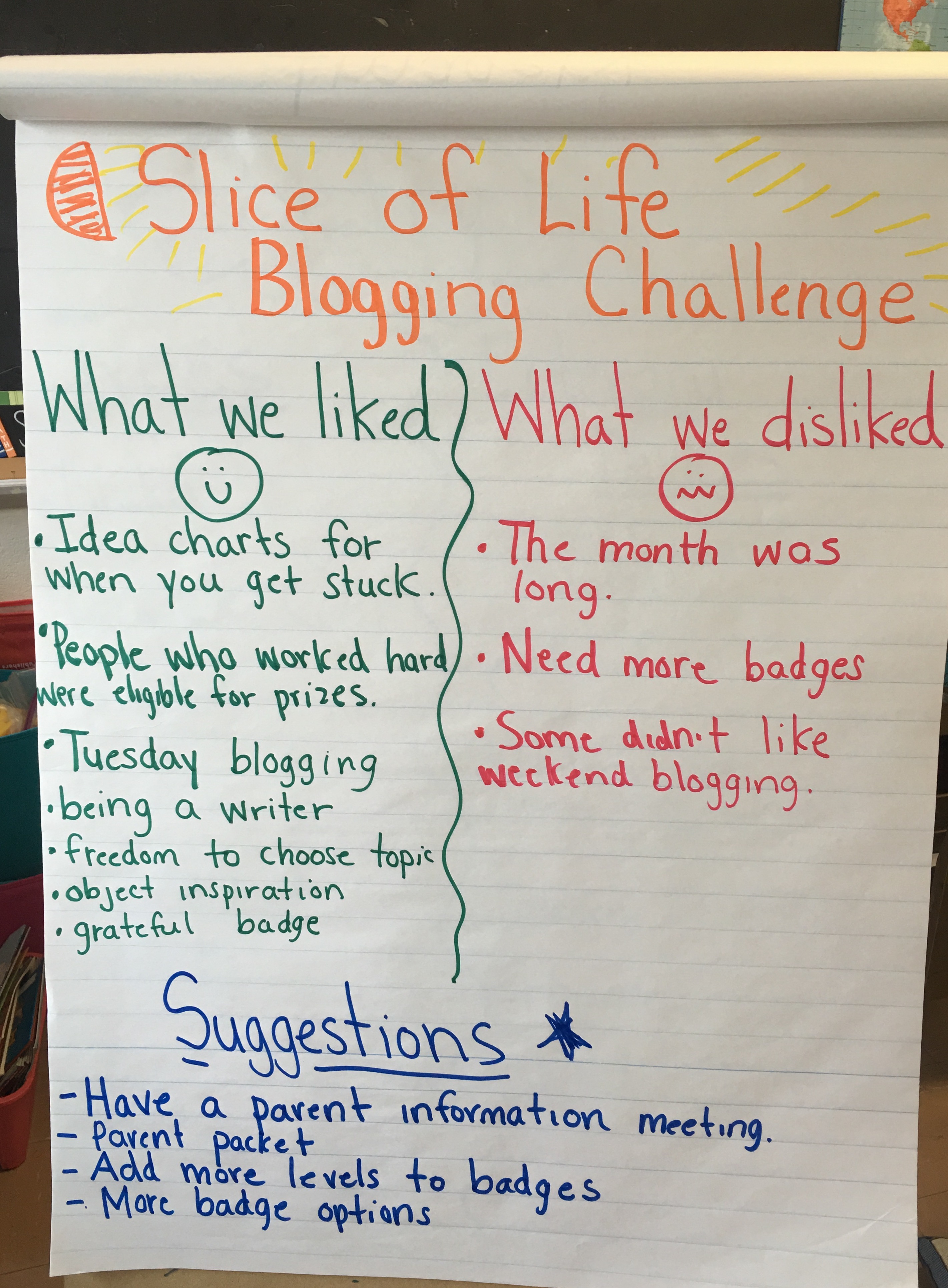 Anytime you try something new, there will be lessons learned. The Classroom Slice of Life Story Challenge (SOLSC) was an ambitious endeavor for my third graders, but a very worthwhile one. As I reflect on the experience, I consider the successes, the difficulties and ways to improve upon what I started this year.