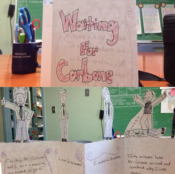 I also wrote several of my own book arts styled stories right alongside the scholars. Mine are outside my office and feature stories of my adventures with my administrator colleague, Mark Carbone (he’s the principal at the middle school next door where our scholars will eventually go). Everyone LOVES these (including Mark, even if he won’t admit it).