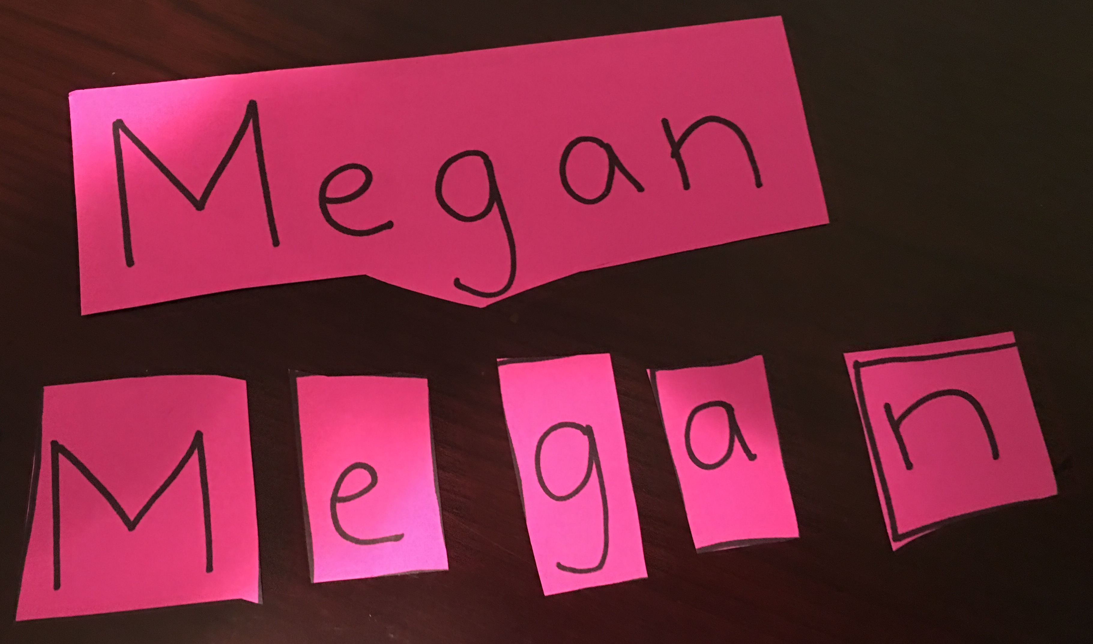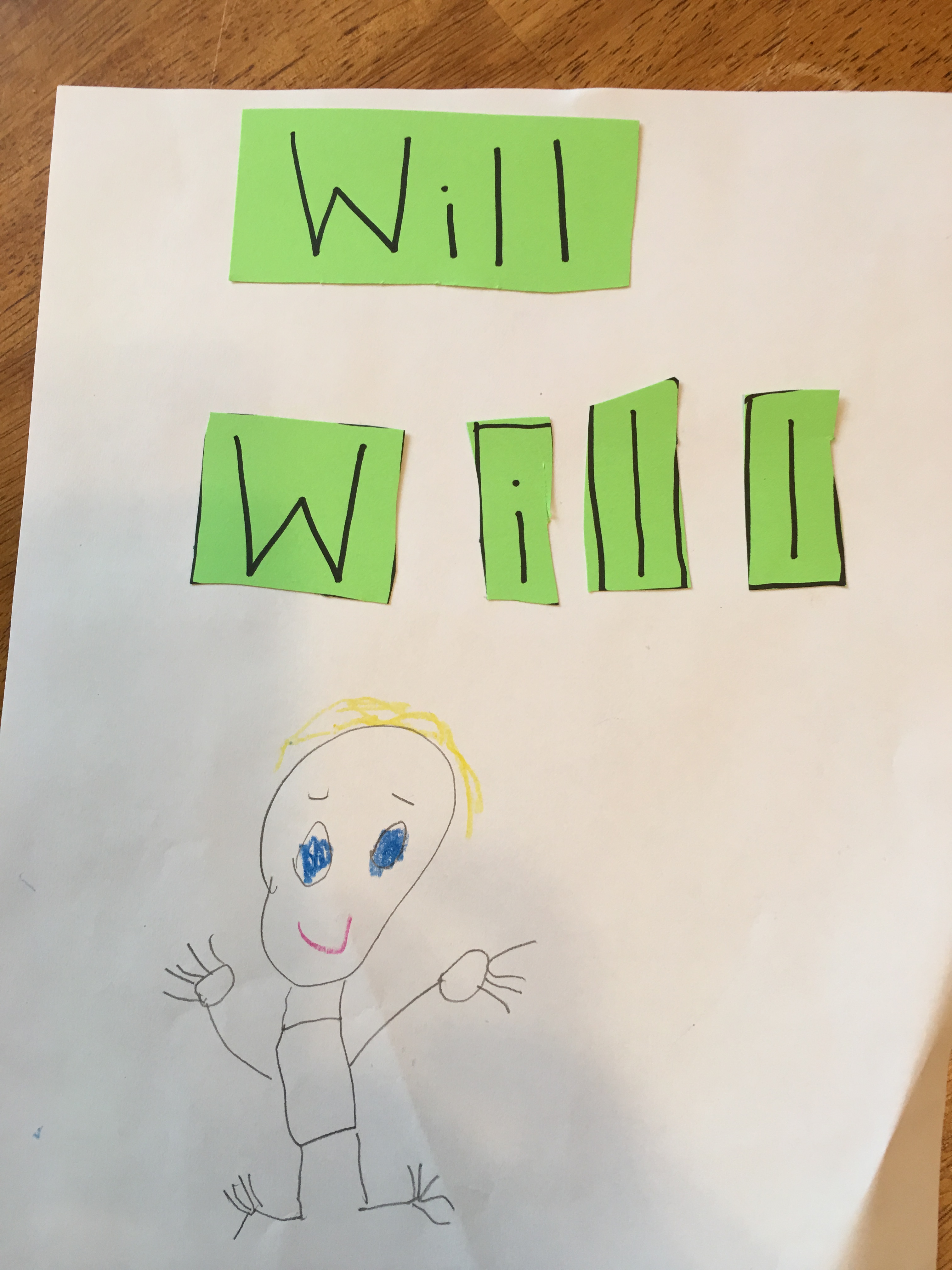 For my son, Alex, we are using his cousins’ names. I’ve been having him cut out the letters for extra fine motor practice and I say the whole thing to him as he does it: “Will’s name is a word. It is made up of letters. Let’s cheer for his letters….let’s count his letters.” Alex has to glue Will’s name in order and then we talk about how Will looks and how we can draw him. My hope is we can make a book of all his cousins’ names and pictures and when we are finished, Alex will have internalized the difference between words and letters, uppercase and lowercase, and he will know better how to draw a person with all of their parts.