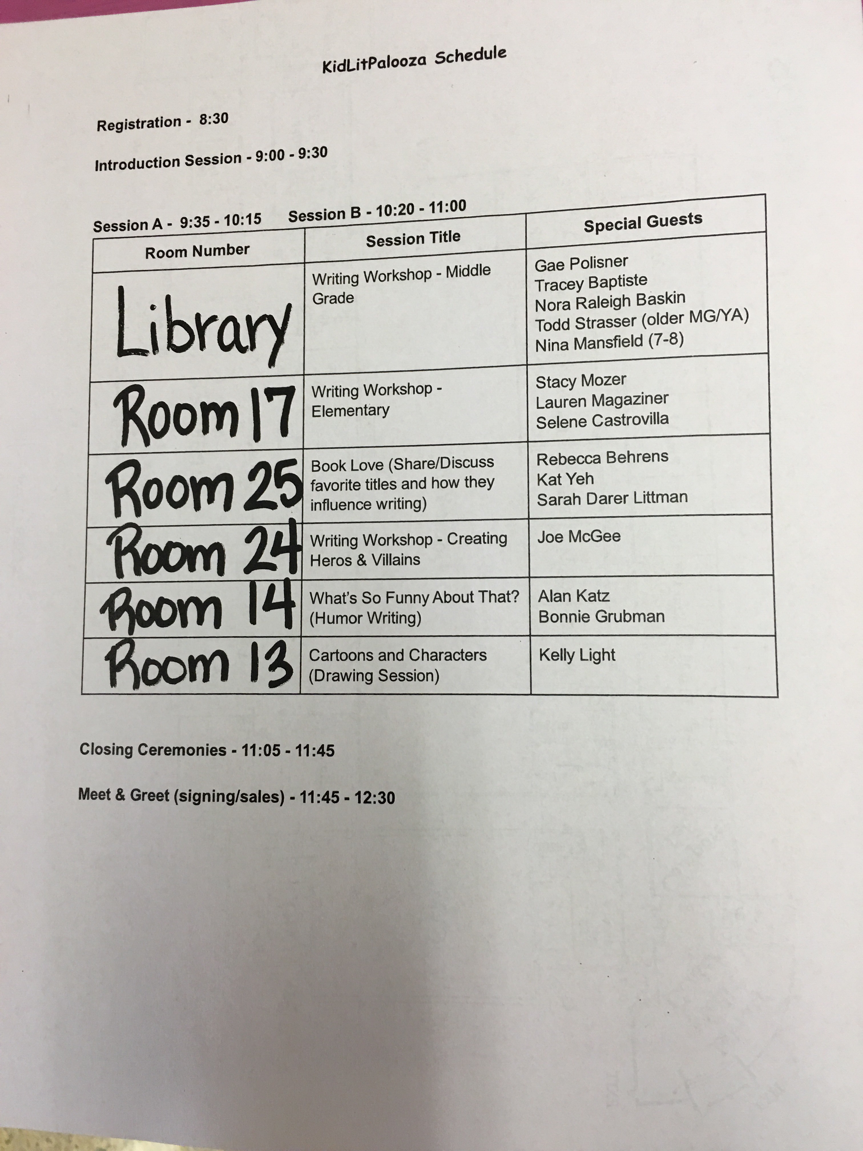 Moments like that drive home the point that reading and writing are not just things we do at school, but “life work” as my friend, JoEllen McCarthy passionately says. JoEllen McCarthy is a literacy consultant and one of the organizers of NerdCamp LI, in addition to being The Educator Collaborative’s Book Ambassador. JoEllen has joined forces with author Gae Polisner and teacher Kristen Picone, both also on the Nerd Camp LI planning team, to create #KidLitPalooza. Last year, Gae Polisner organized #Authorpalooza to connect children’s and YA authors with students. #KidLitPalooza expands upon that idea of connecting kids with authors. Students from grades 3-8 in Long Island schools were invited to participate in this event, which takes place today at Old Bethpage Elementary School. Students will be able to select the session they want to attend, and workshops will be run by the authors and illustrators, including Gae Polisner, Kat Yeh, Tracey Baptiste, Alan Katz, Selene Castovilla, Lauren Magaziner, Bonnie Grubman, Nora Raleigh Baskin, Stacy Mozer, Nina Mansfield, Joe McGee, Sarah Darer Littman, Kelly Light, Rebecca Behrens, and Todd Strasser. Participating students were encouraged to bring their writer’s notebooks with them and their questions for the authors! Later in the day, there will also be a read aloud where authors will select a section of their book to read for just one minute. Students will have the opportunity to buy books, meet the authors and have their books signed.