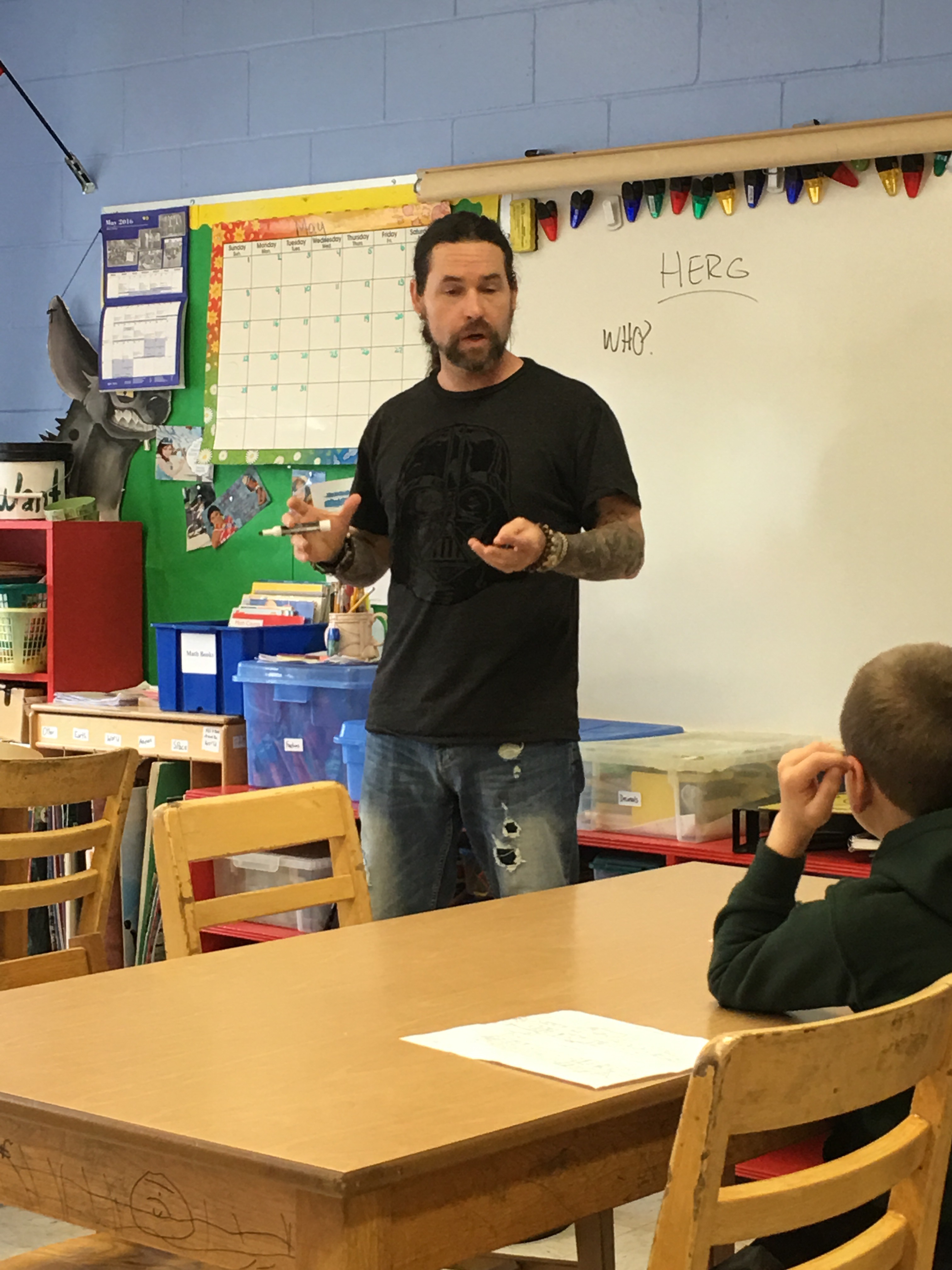 Some of my fantastic third graders talking with Joe McGee about villains!