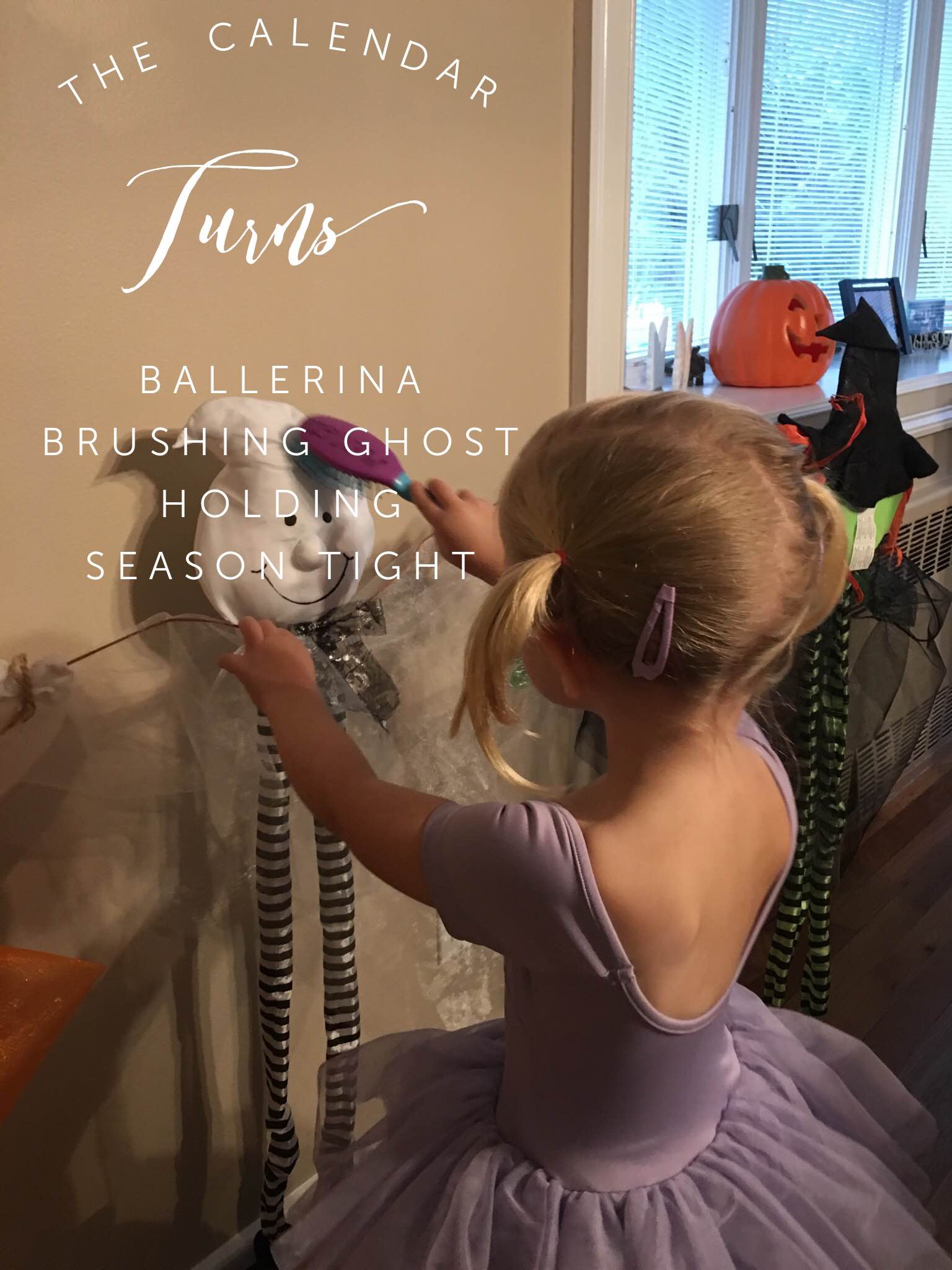 My first haiku and picture of the month- my daughter dressed for ballet admiring our Halloween decorations.