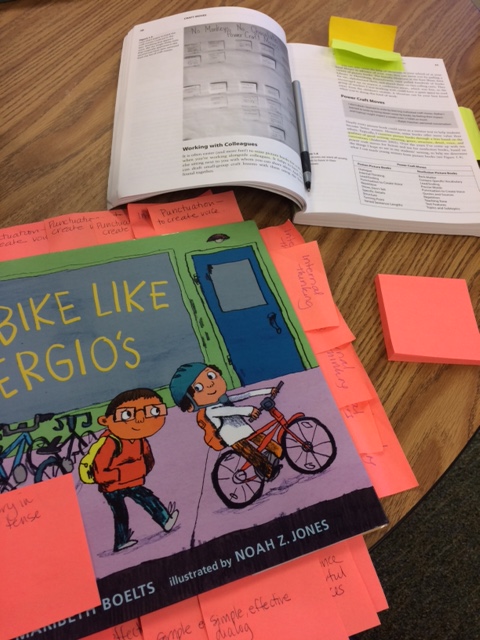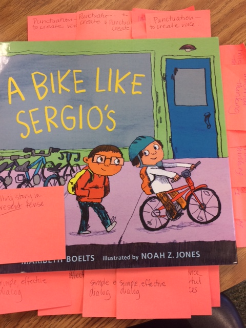 After looking at Stacey’s list of power craft moves (page 11), I read and reread A Bike Like Sergio’s with my writer lens.  Since the book does not have page numbers, I placed my sticky notes directly on pages, rather than on a separate chart.  This is what my book looked like when I finished: