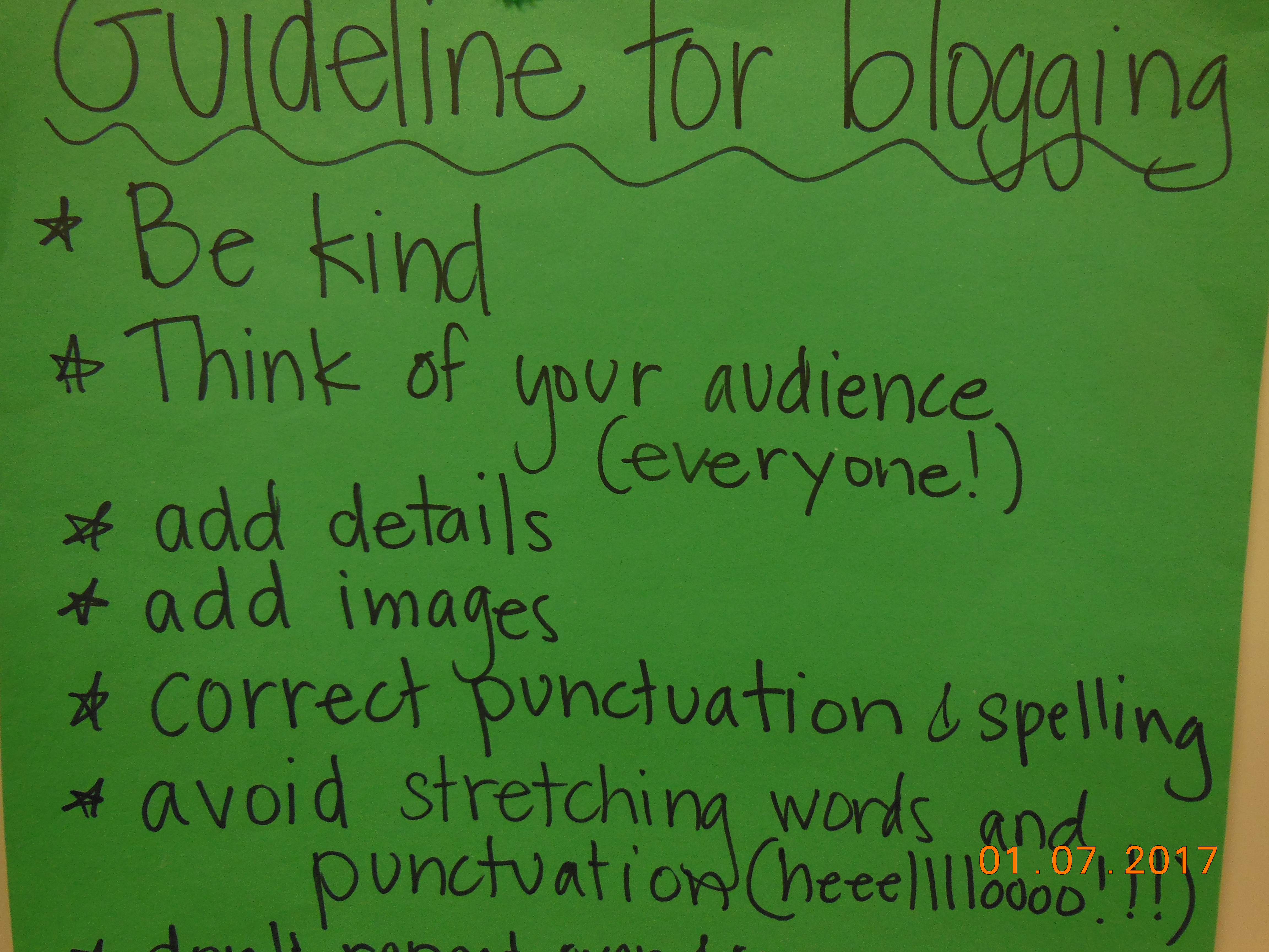 After a couple weeks, volunteers share a blog post with the class. I display that post and have the author read it out loud. The student usually points out mistakes he/she has made and we, as a class, can make compliments on the writing and give suggestions for improvement. This also gives others in the class a chance to admit they have made the same mistakes. This is when I show the students how they can go back to a post and edit.