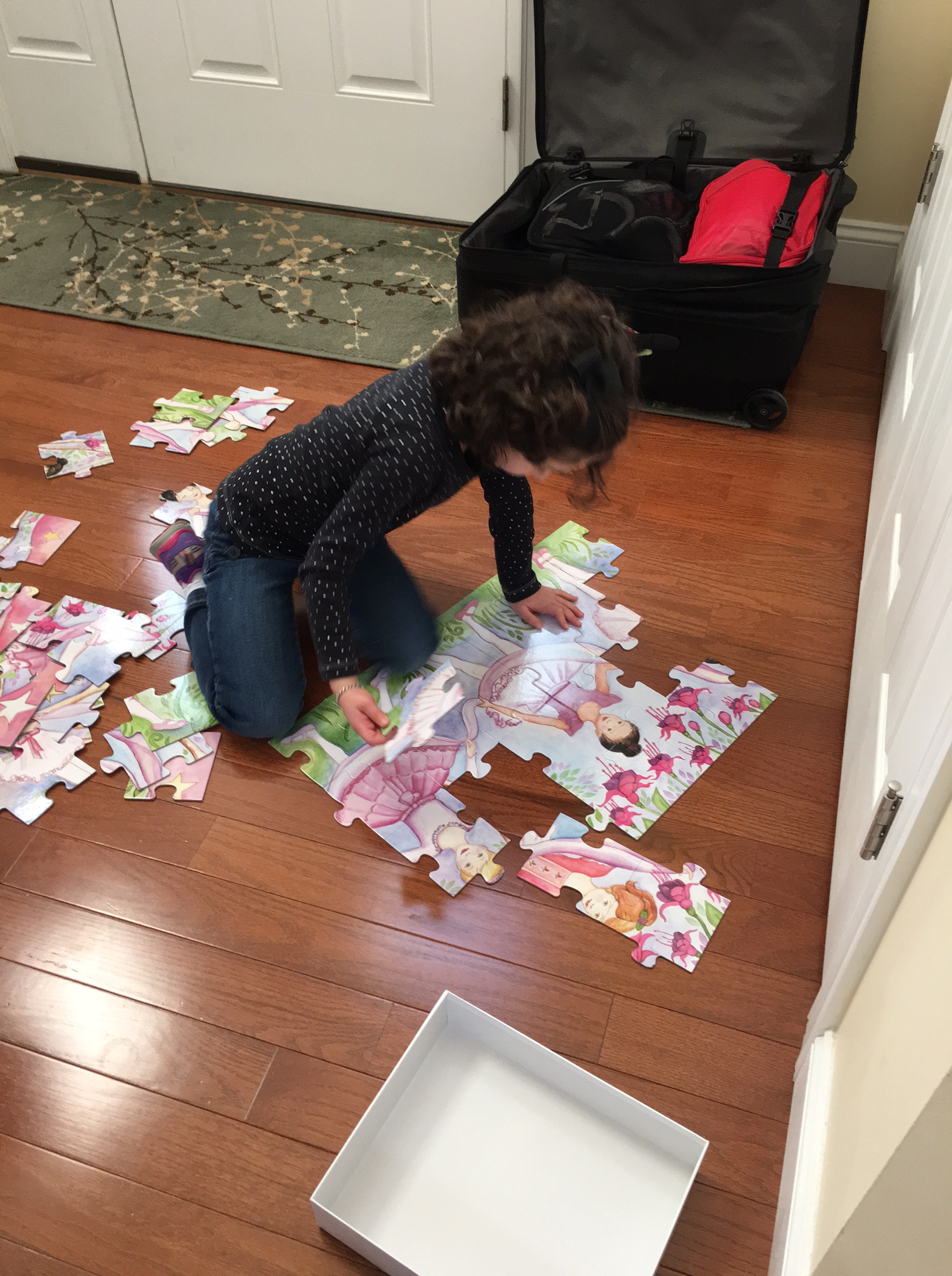 I had hoped Isabelle would use what she knew about puzzles to get started. I had hoped she’d find the corners. But she didn’t. Instead, she looked at the picture on the box and put together the center of the puzzle. Even though I’m not a puzzle master, I didn’t think that was the way to go. However, I kept my mouth shut I continued to unpack our suitcases.