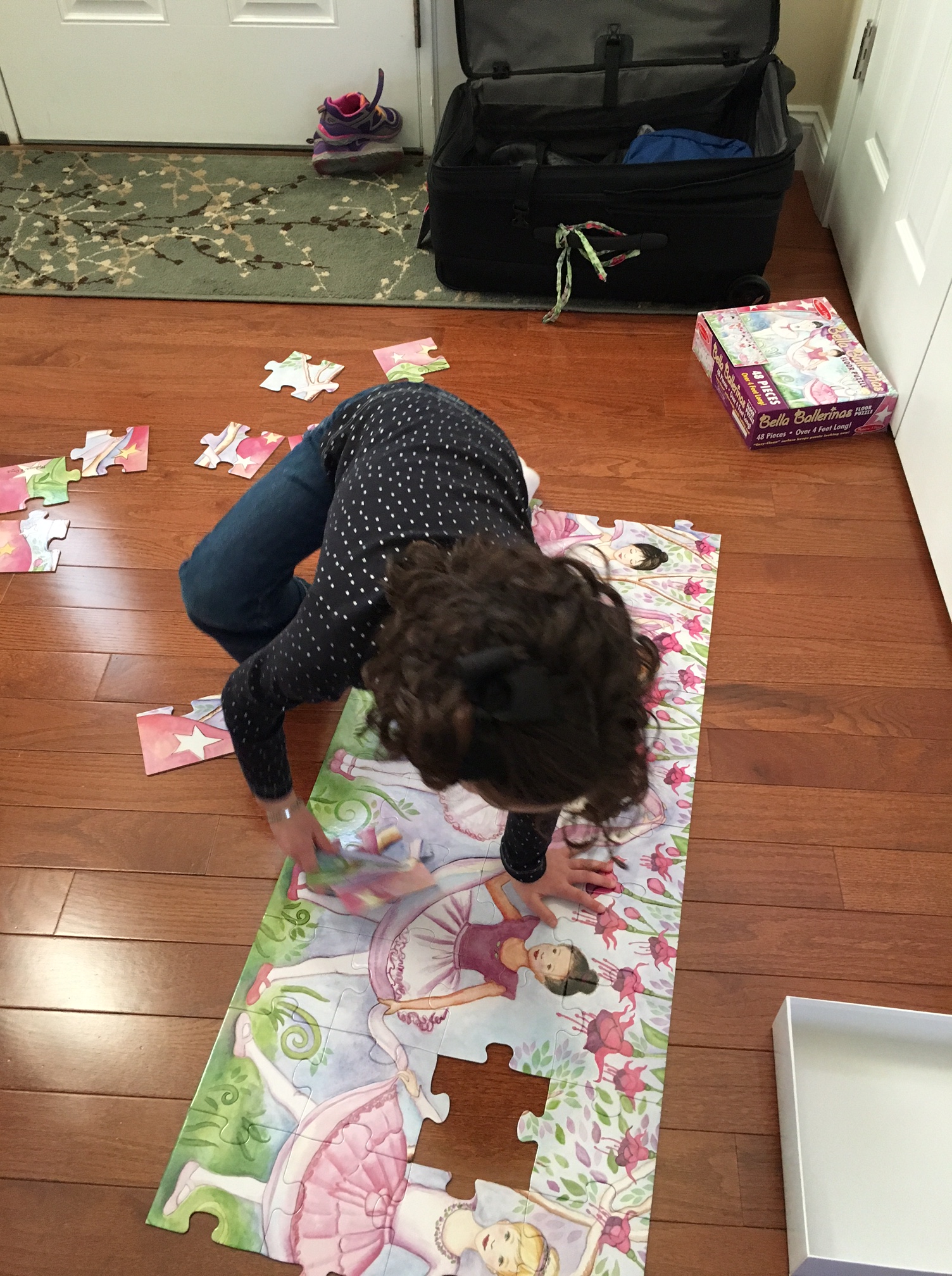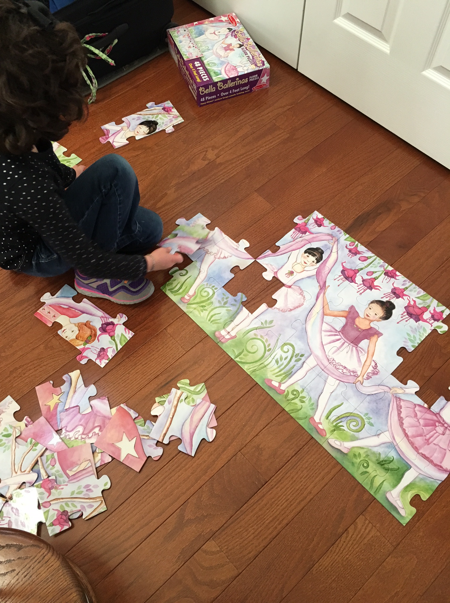 Last Passover, my daughter received a 48-piece floor puzzle from our cousins. I didn’t let her open it that night since Isabelle had never done more than a 24-piece puzzle in the past past and I didn’t want her to get frustrated before the Seder. As soon as we got back to Pennsylvania, Isabelle wanted to play with the puzzle. My husband and I needed to unpack. I worried handing over the puzzle to Isabelle would delay our unpacking since she’d need adult assistance. But she begged to do the ballerina puzzle so I figured what the heck, removed the shrink wrap from the box, and let her have at it.