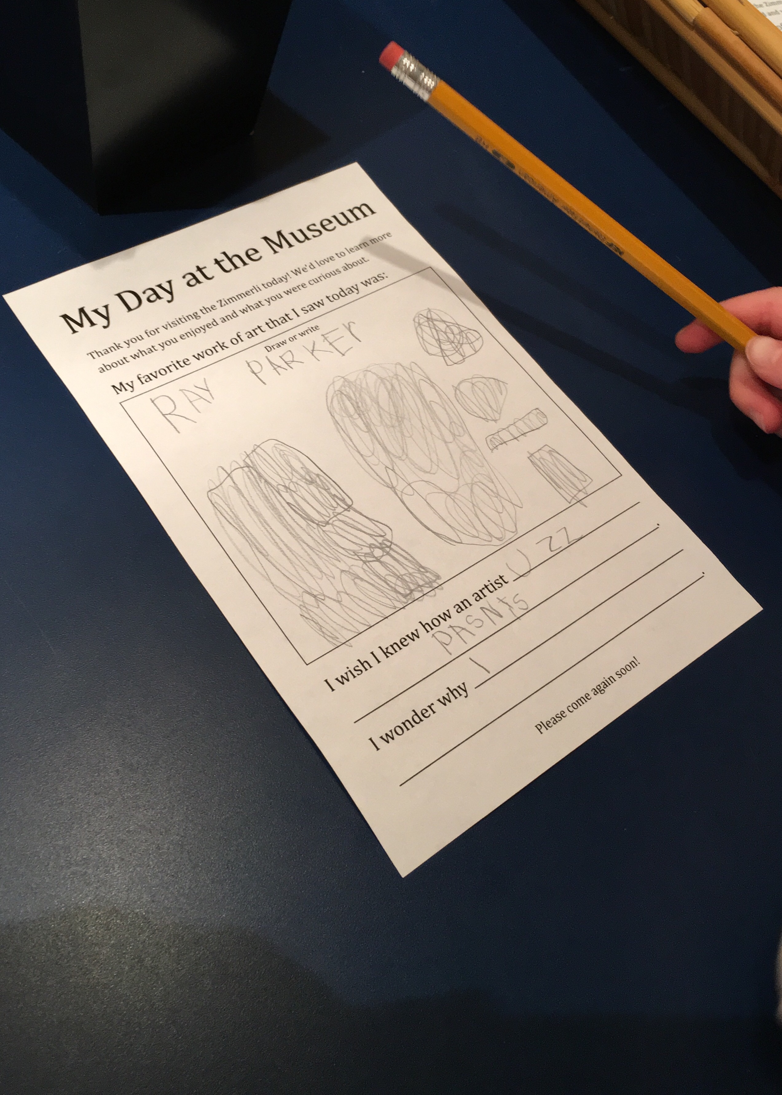 We visited the Zimmerli Art Museum when we were in New Jersey last month so Isabelle, who is interested in art, could sketch the paintings and sculptures in her sketch book. We found a kid-friendly room inside of one of the galleries towards the end of our visit. Isabelle noticed a piece of paper entitled “My Day at the Museum” with a basket of pencils beside it. She wanted to fill it out so we sat down and she completed it. As she was drawing and writing on the museum-created form, I thought it might be neat for me to create a short reflection sheet like this for her to fill out on the car ride home from museums and botanical gardens we visit this summer.