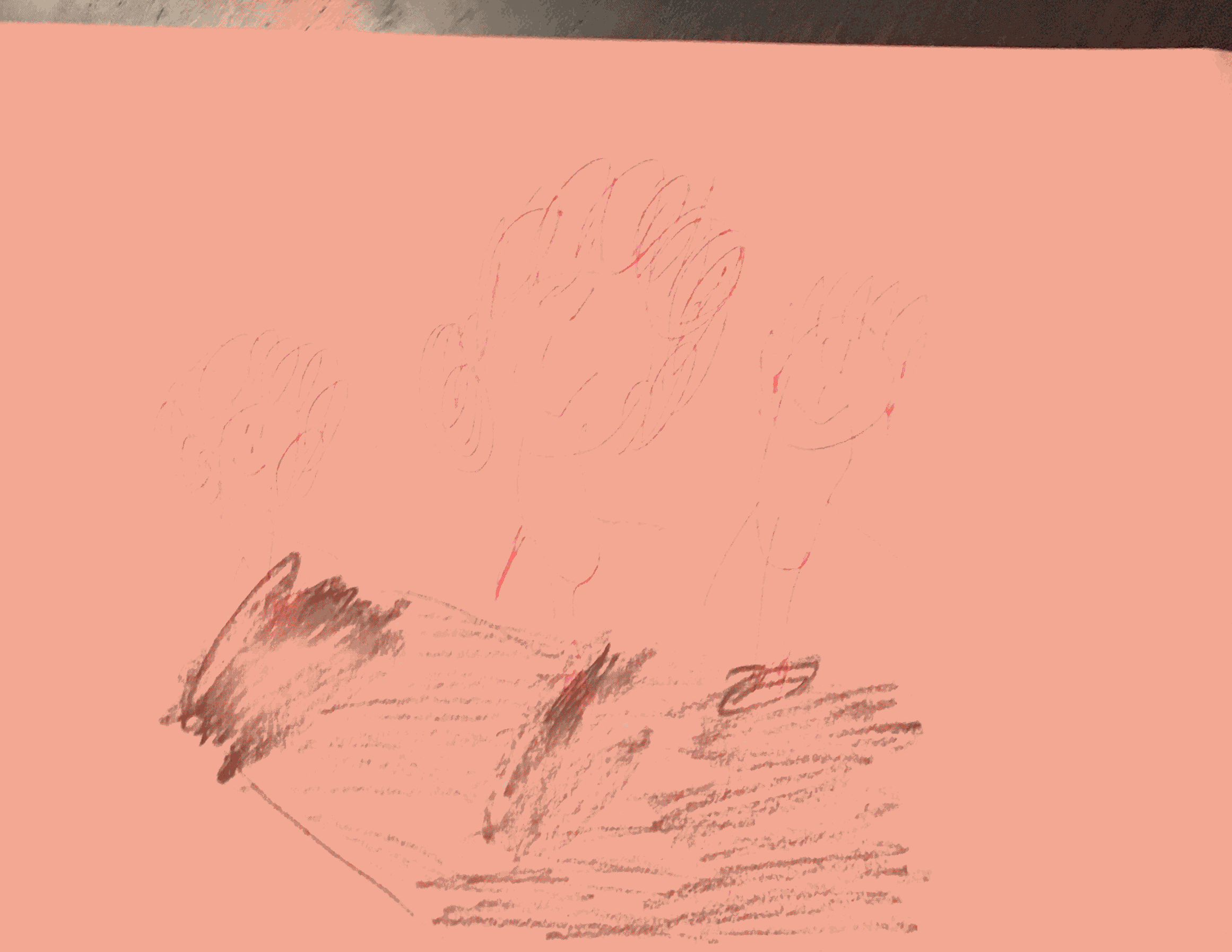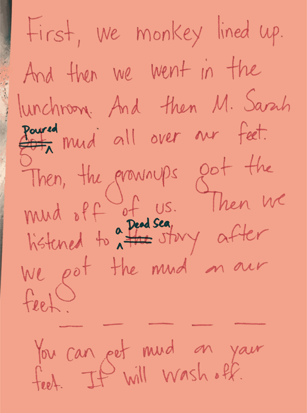 After Isabelle retold the story to me, I read her words back to her. I asked her if she used the most specific words possible. She wasn’t sure. Therefore, I went back to two places in the story she told me and asked her if she could use more specific words. She provided me with more precise language, which I inserted. Then, she disappeared. Had I pushed too much? It turns out I hadn’t. She returned a few minutes later with a construction paper drawing of her and her friends with mud on their feet, which she asked to staple to the story I jotted down for her.
