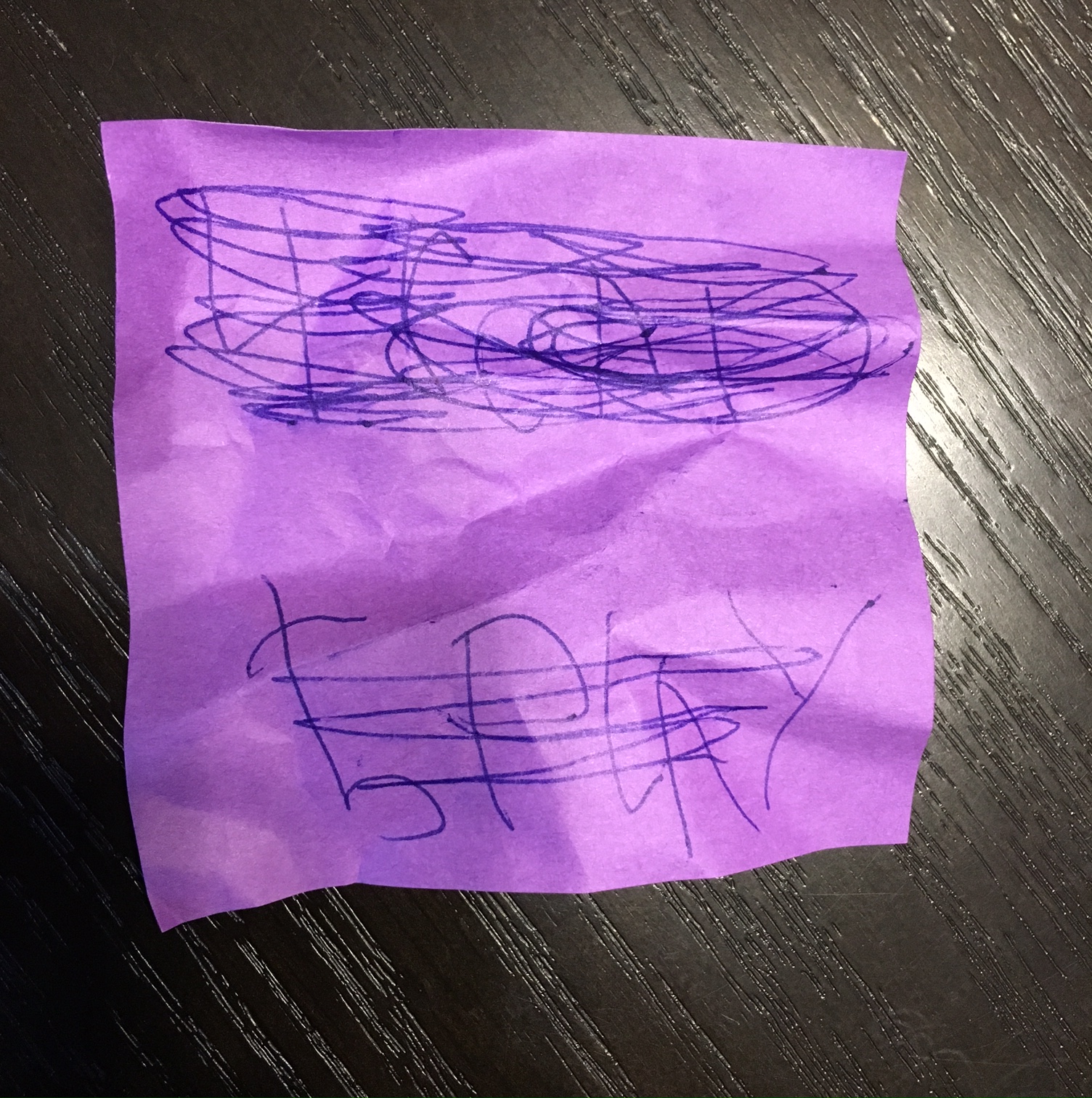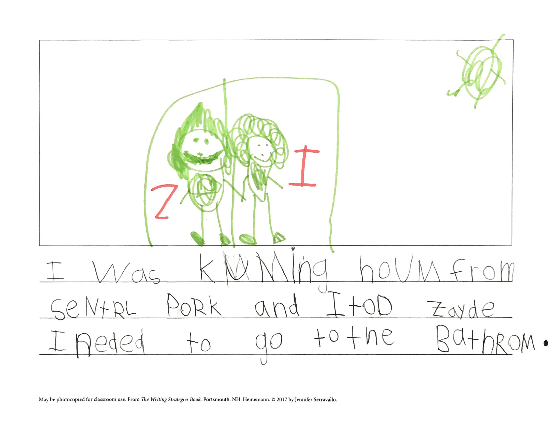 A few days later, we sat down together. I taught her the say-sketch-write strategy. (NOTE: Her Kindergarten teacher uses Kidwriting, rather than Units of Study so I needed to scaffold her telling a story across pages.) Here’s what she came up with: