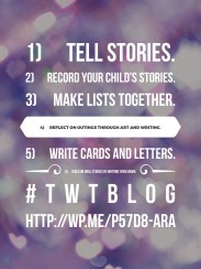 So many quick and easy ways to tell stories with our children in those few minutes here and there. It doesn’t have to be sit down and “hold the presses”(and life) for an hour. I love the “organic” stories about writing with Isabelle!