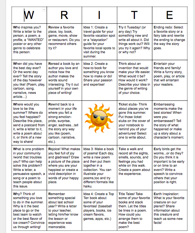 Isn’t it interesting that everyone has a summer reading game/program but so little for writing? Love the bingo board of options for providing the right level of structure, choice, and challenge for the summer. Another key component, as you mentioned, has to be the sharing. I love the Padlet suggestion. I’m also wondering if it would be possible to set up one or two casual writers meet-ups at the school, public library, or even a park. Thanks for the idea and the resources!
