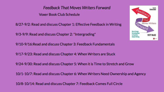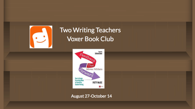 At the start of the summer, I read and reviewed Patty McGee’s Feedback That Moves Writers Forward. It’s a book, I believe, that can change my teaching of writing for the better…and maybe yours too. It’s a book I want to dive into more deeply, rereading it and sharing my ideas with other educators in a book club. I know that the beginning of the school year is a challenging time to ask teachers to take on anything additional. But here I am anyway, inviting you to take part in a Voxer book club to discuss Feedback That Moves Writers Forward. So why should you?