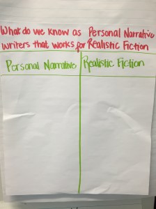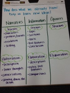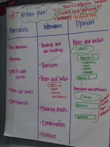 2. When you are switching genres, this is a good time to clear out charts and learning tools that students don’t need any more. If you are moving on to an information unit, they don’t need a narrative process chart. However, if you explain why you leave some charts and not others, students have an easier time holding on to what will help them. For example, a conventions chart should stay, and a chart about workshop structures might stay. Clear spaces give room for for new learning and new charts that explicitly show the lines of transfer, charts like the ones I’m sharing later in this post.