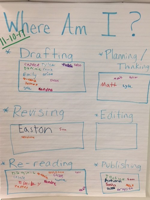We love the chart you used to have students identify where they are in the writing process – It is so great to see so many names in the rereading box. Rereading is a big part of writing that sometimes students overlook. Thanks for sharing your thinking with us