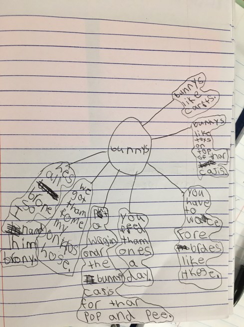 I noticed he attempted to start with some sound words (kids love onomatopoeia) and something interesting to get his reader anticipating the rest of his piece. I told him his plan was a really detailed start for an information piece but I wondered if he could tell me a story about bunnies.