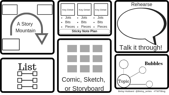 We re-watched the video together, and he agreed to share the video with the class. I asked him if he thought we could all work together on his plan as a group. This would not only model several of the planning methods students had learned already, but it would also be another chance to rehearse the story again for Aiden before he went off to draft. As a class, we decided to choose a beginning, middle, end structure. Here is a peek at the planning menu I’ve given students to keep in their planning notebooks this year. It has blank spaces for planning ideas they come up with on their own.