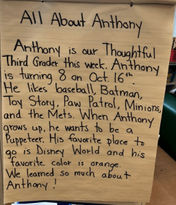Inside my classroom on a Monday morning, I hear my third graders out at their lockers, buzzing, “Who is the Thoughtful Third Grade?” They look on the wall and see the lucky student’s name, picture and acrostic poem hanging up. Another third grader will have the spotlight this week!