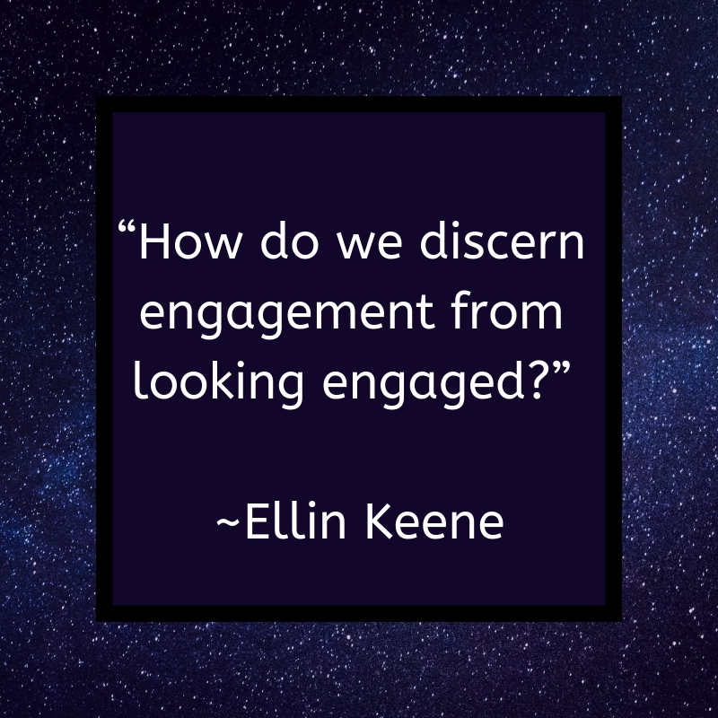 I hope to continue to mull over these questions. I hope to get closer to deep understandings of what engagement truly is. I sometimes wonder if I want to achieve student engagement so much that I fool myself into thinking I’ve achieved it when potentially it is under the cape of compliance, routine, or participation. One might want to argue these somehow inform engagement, but consider–when was the last time you were truly engaged in something. How do you know?