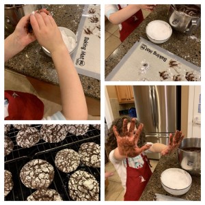 I recruited my children to help me bake Chocolate Pretzel Crinkle Cookies one snowy Saturday night in January. My two-year-old son, Ari, helped dump items into a bowl to create the batter, while my eight-year-old daughter, Isabell,e volunteered to roll the cookies into balls and coat them with powdered sugar. Sounds idyllic, right? Here’s the thing: the dough was super-sticky! Isabelle felt as though she was failing when she was unable to roll the dough into balls so we could coat the dough-balls in powdered sugar. After several attempts, she watched as I continued to struggle as the dough stuck to my hands. The end result was a cookie that Isabelle declared “tastes like a snow day.”
