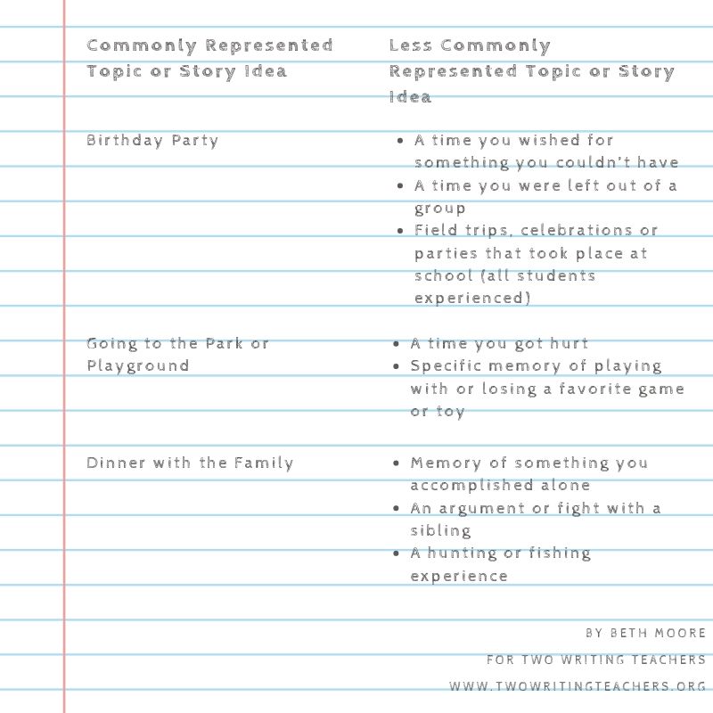 I almost included “Sports” and “Winning” as a commonly used topic. It is certainly a common topic in popular culture. However, in schools, I have found that kids write about sports and winning far more often than teachers use for modeling. In fact, I’ve had several experiences where teachers expressed they wished their students would write about something other than sports. (See the links below for thoughts on how to handle topics your students write about over and over. Many writers have topics we write about all the time — we call those topics “Writing Territories” and it’s probably a good idea to harness the power of your students’ writing territories rather than resist).
