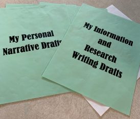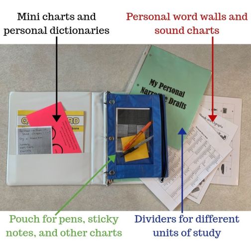 Different teachers find different ways to store materials and create a welcoming environment for their writers. What I’m sharing here today is by no means a recipe for the perfect workshop, and I genuinely believe that a great teacher can make any tool work well. One tool I prefer to help my students keep their writing organized is a one-inch binder with at least one pocket on the inside for storage. Some teachers prefer folders, and as a kindergarten teacher, I did prefer the two pocket folder for student booklets.