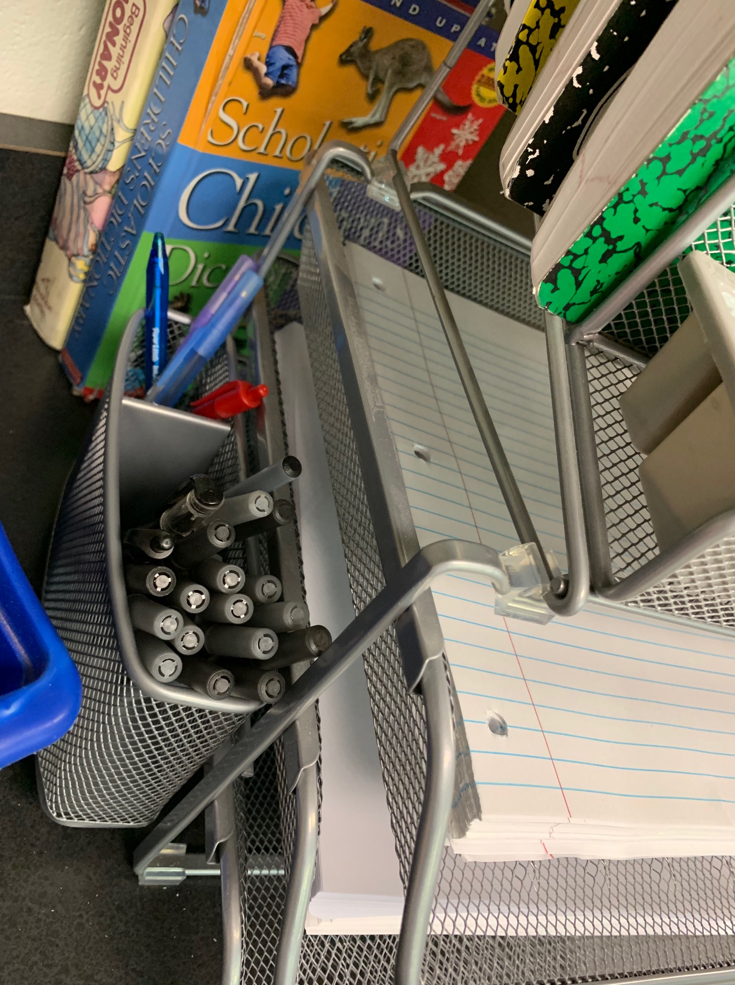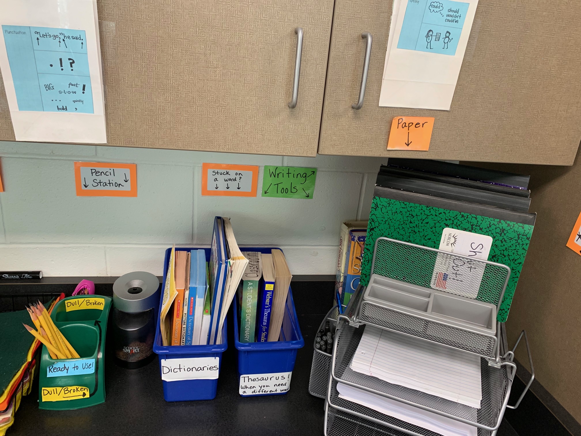 I have a small writing center set up on my counter with some basic extra supplies. I have a spot for black pens, color pens, and paper. As the year progresses I add items for student publishing, a set of plastic drawers with additional paper choices, as well as pockets on my cupboard doors to hold checklists and mini-charts I want to make available.