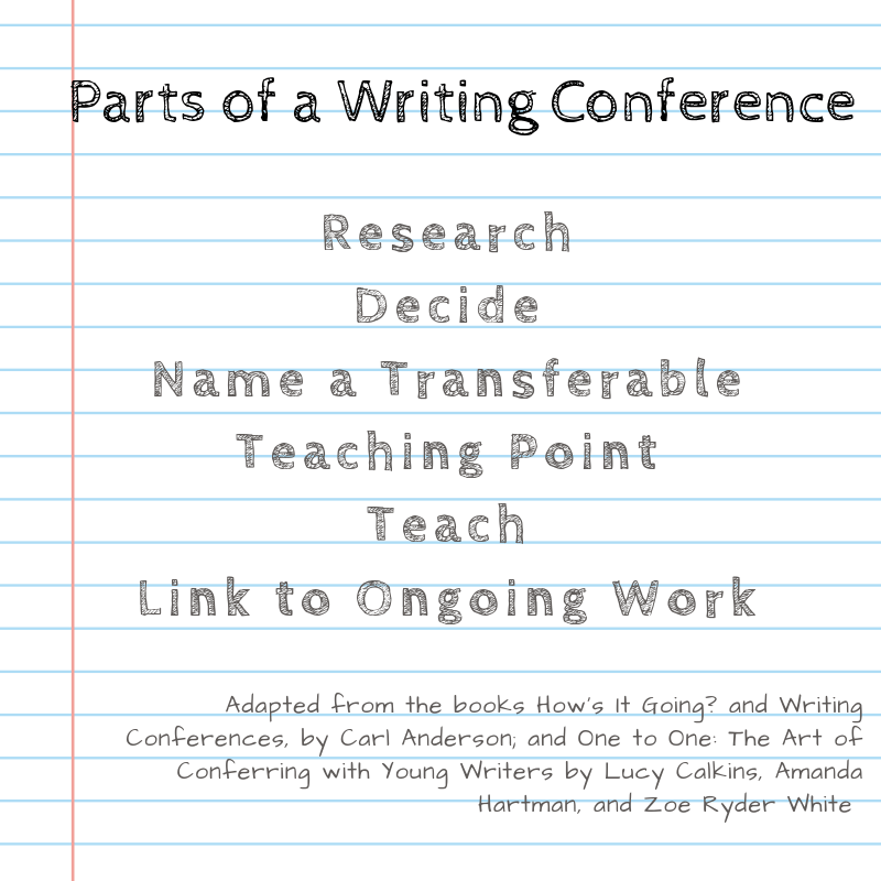 Although the teaching point is just a few sentences, the briefest part of a writing conference–naming a clear, concise, transferable teaching point that is memorable and applicable to many pieces of writing is something that doesn’t always come easily. Remember – an effective writing conference teaching point doesn’t just “fix up” one particular piece of writing. An effective writing conference transfers to many pieces of writing. As Lucy Calkins has famously said, “Teach the writer, not the writing.”