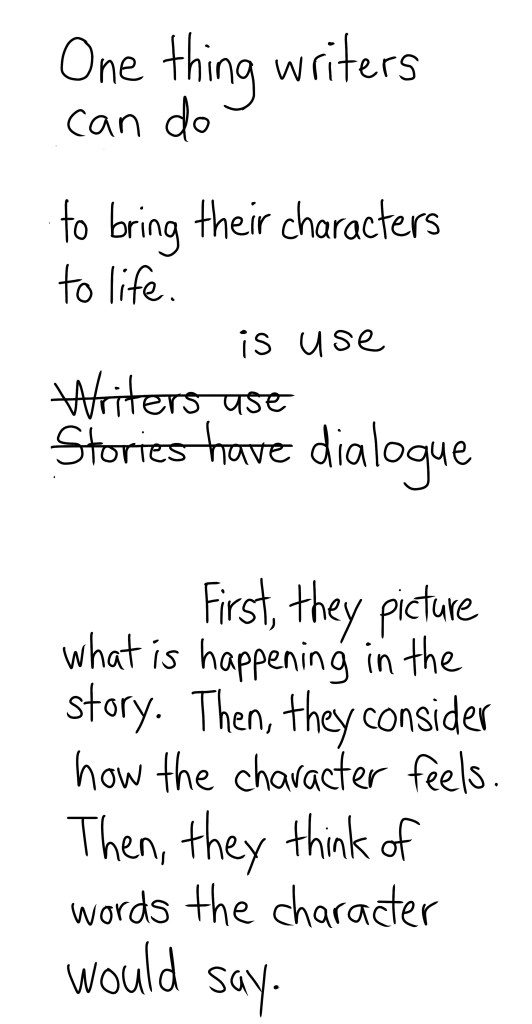 Finally, it helps to say the “big” thing before the “little” thing. Since there are many ways to bring characters to life, not just using dialogue, the teaching point can be revised to reflect what is priority as a writer, and what is secondary.
