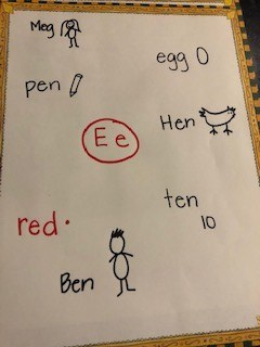 In the current lesson I was observing, the teacher was teaching this group of students the concept of the letter E. While she read from a big book, I created a circle map of objects students would be familiar with the letter E, including “pen, hen, and egg.” Additionally, I added sketches to accompany these words on the circle map.