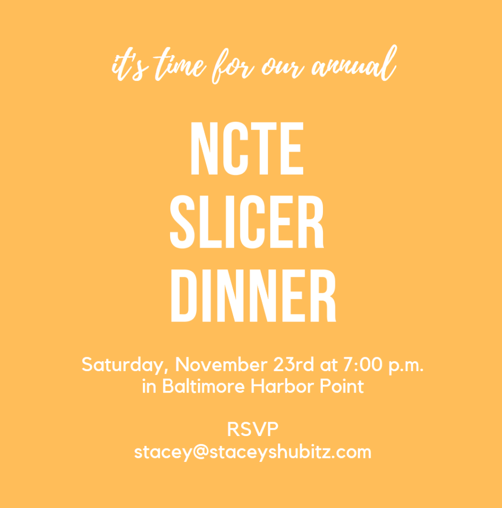 For those of you who will be attending NCTE, please join us for our annual NCTE Slicer Dinner. We have some space constraints, so RSVP to Stacey — stacey[at]staceyshubitz[dot]com.
