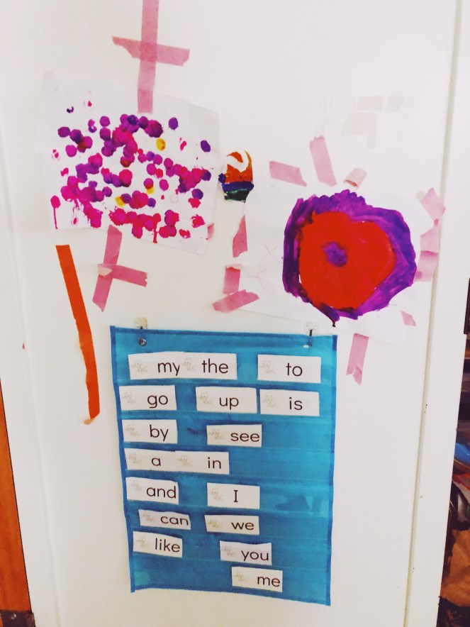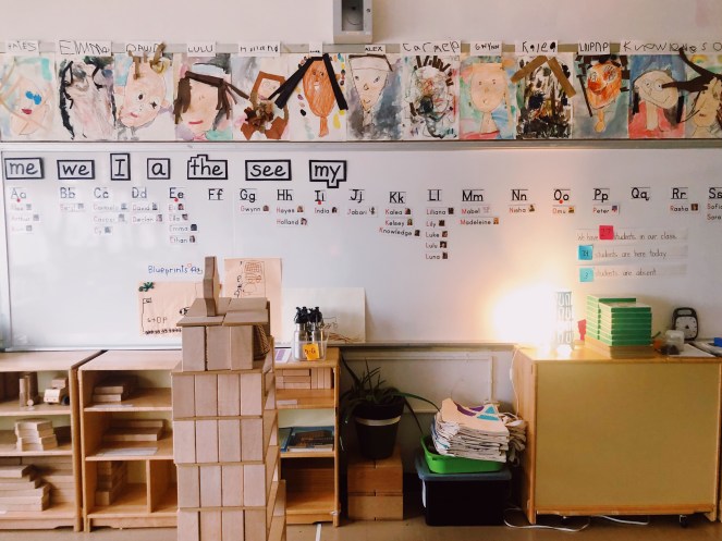 Over the years, kindergarteners have shown me that the kinds of environmental tools that they will actually use are: ones which are at their level, ones which they have meaningful memories (or ownership) creating, ones which they can see themselves in (via photographs or interests), and ones which they can touch and interact with.