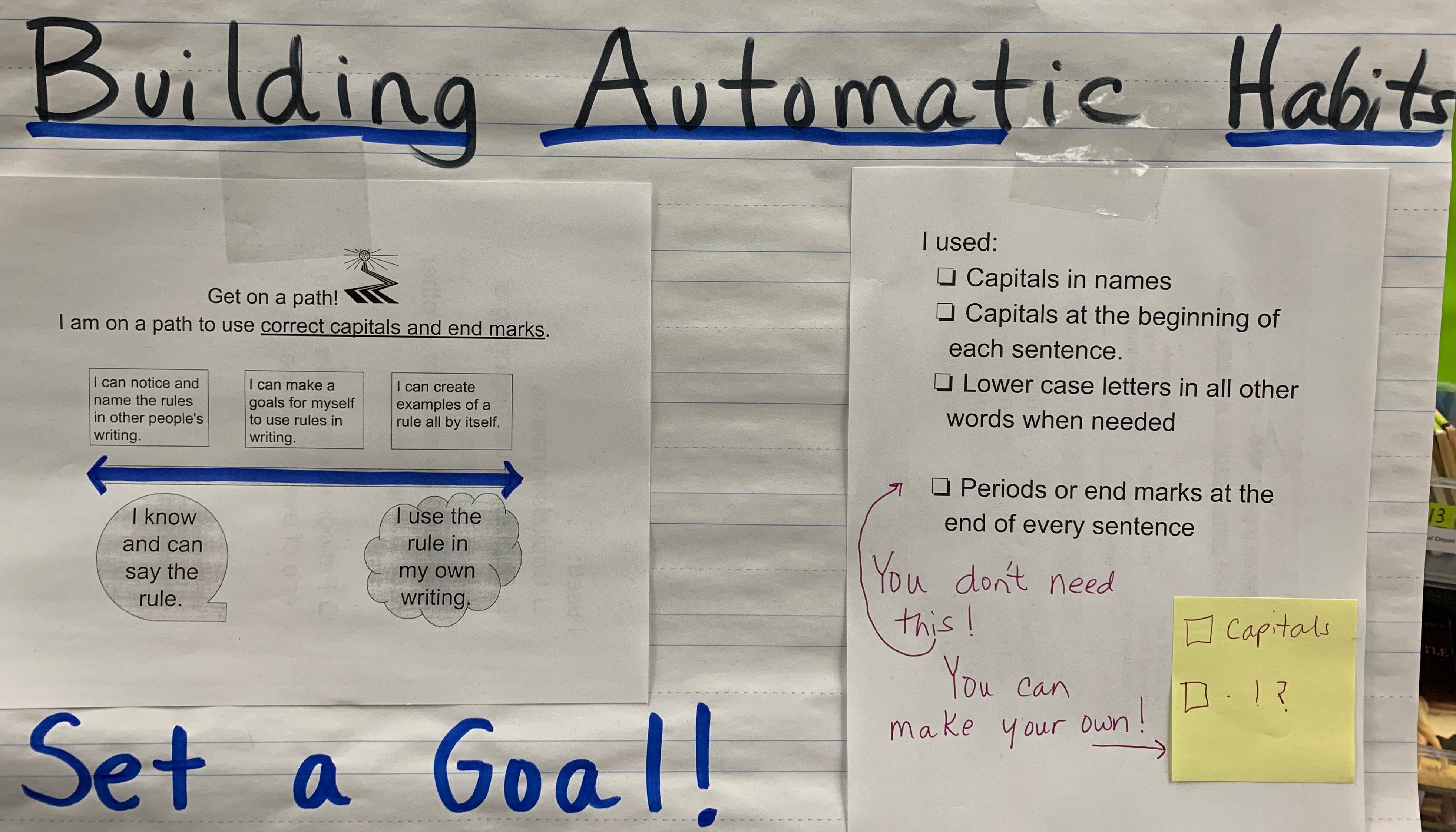 Below is a chart I made during a small group lesson. I wanted students to take ownership of their own goals, so I modeled how to take what they knew about checklists and make their own.