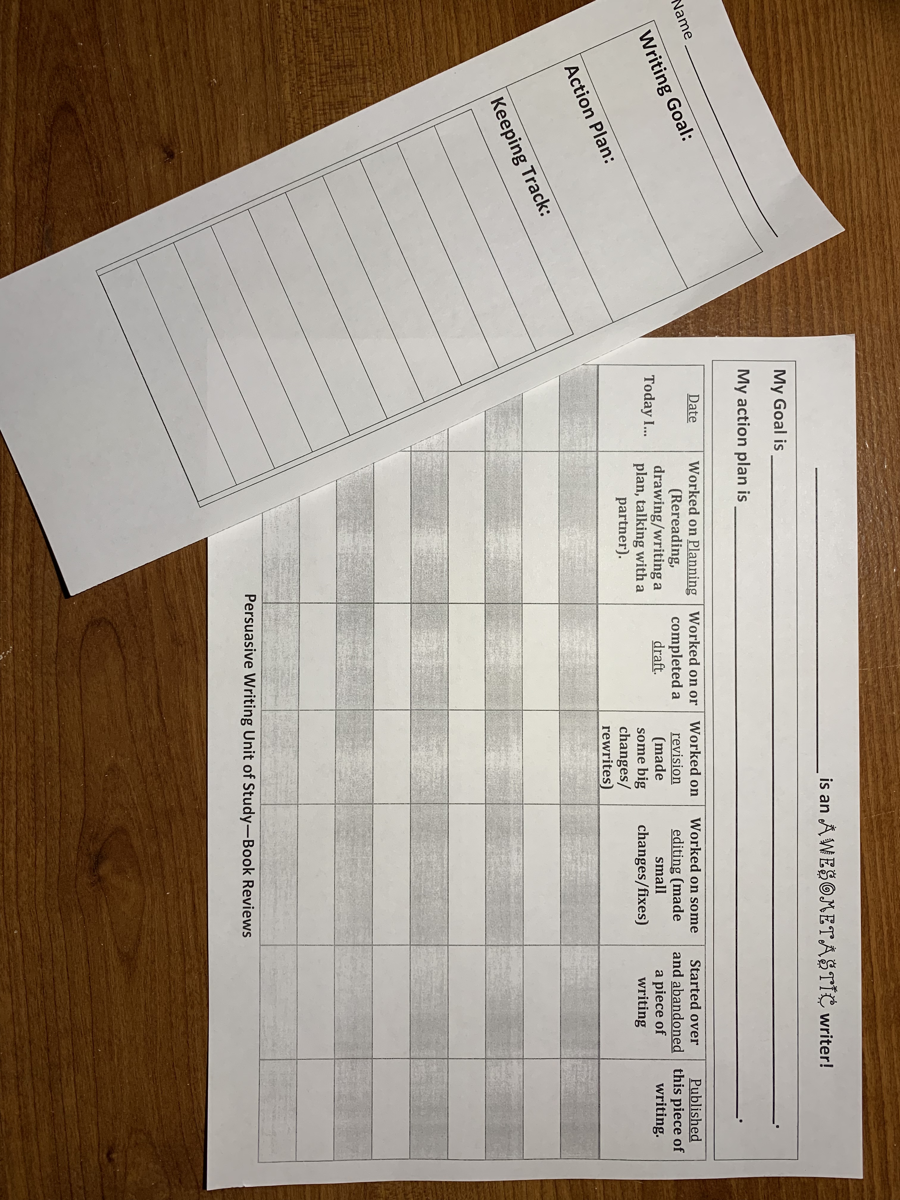 Here is an example of a goal/strategy tracker and a writing process tracking sheet that I have used with students to help them enter areas of the process that they hope to improve.