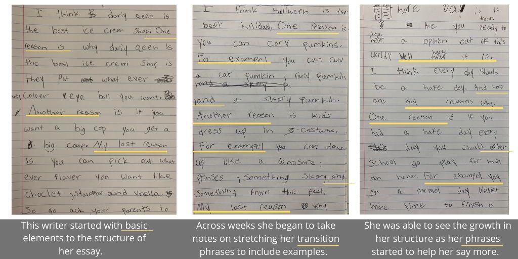 Within a whole class conversation, I shared a different type of progression using a chart. I broke apart a paragraph within an essay to show how I elaborated. This showed my writers how I could have explained my reason in a simplified way or with more development. This helped my writers determine how they, too, could grow and develop their essays to support their opinions with stronger reasons. A day later, I expanded my examples with a different reason, right on the same chart, showing how we can grow areas of our essay from one step to another.