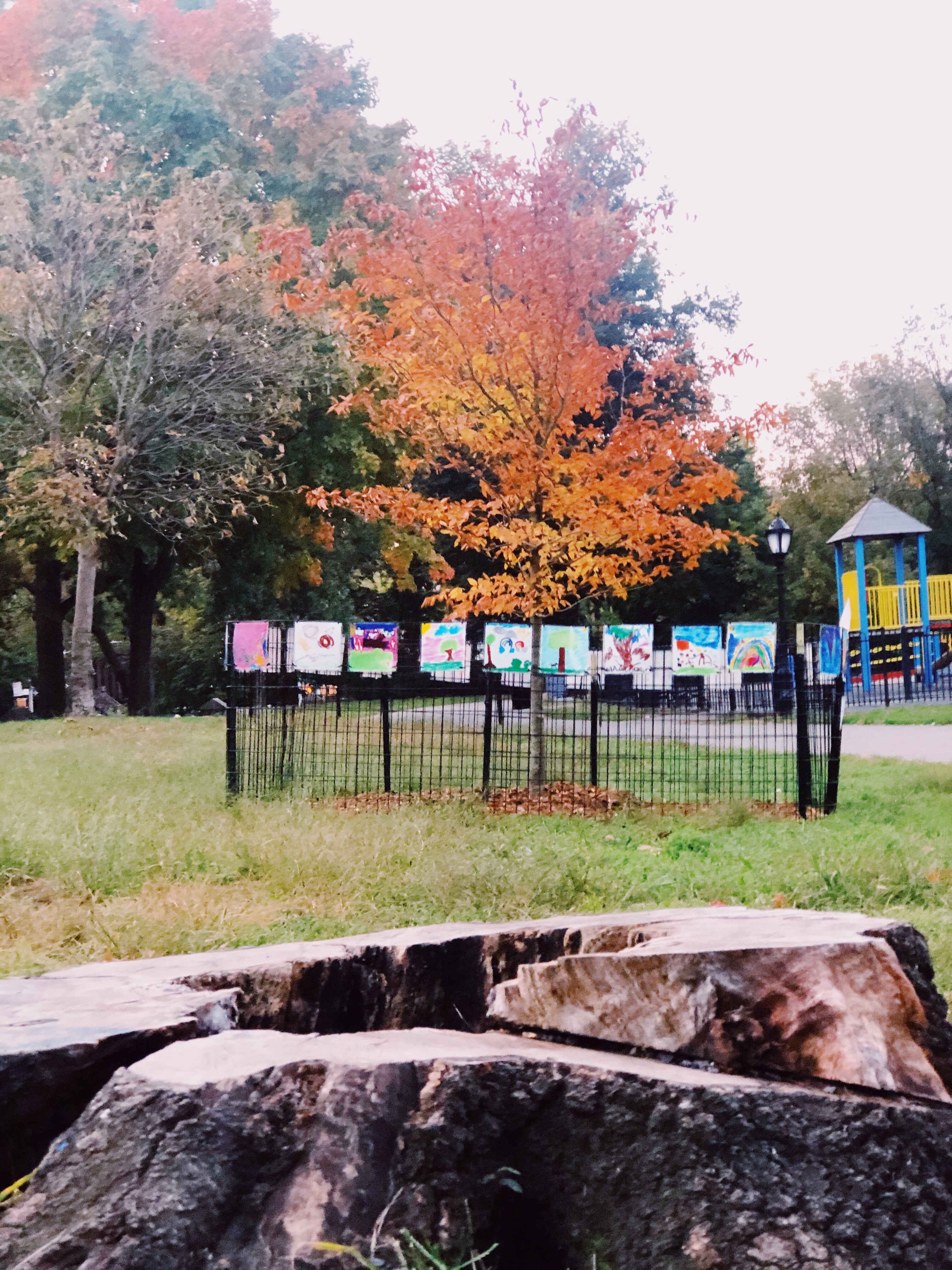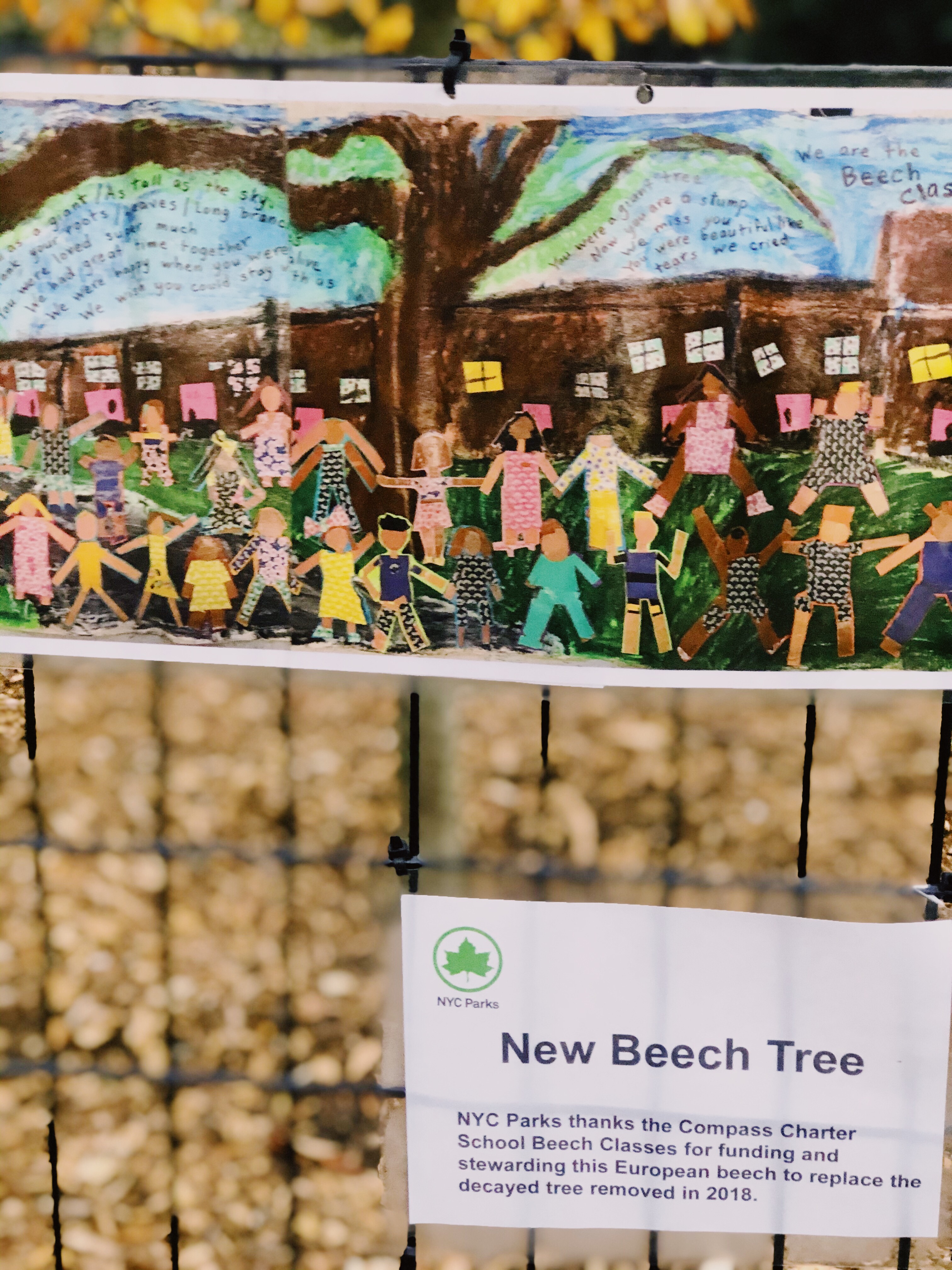 Their hard work was worthwhile and impactful. In October of 2019, a new beech tree was planted (with help from former and present Beech students) near the stump of the old beech tree, purchased with the funds children raised. It now stands in Fort Greene Park, protected by a fence, decorated with drawings by the new Beech kindergarteners and the mural and poem created by the former Beech class. The beech tree stump remains a favorite place for kindergartners to gather, play, and explore.