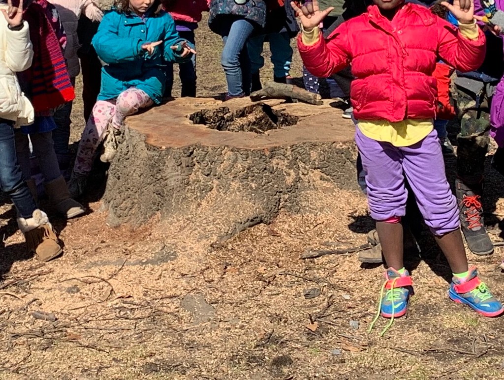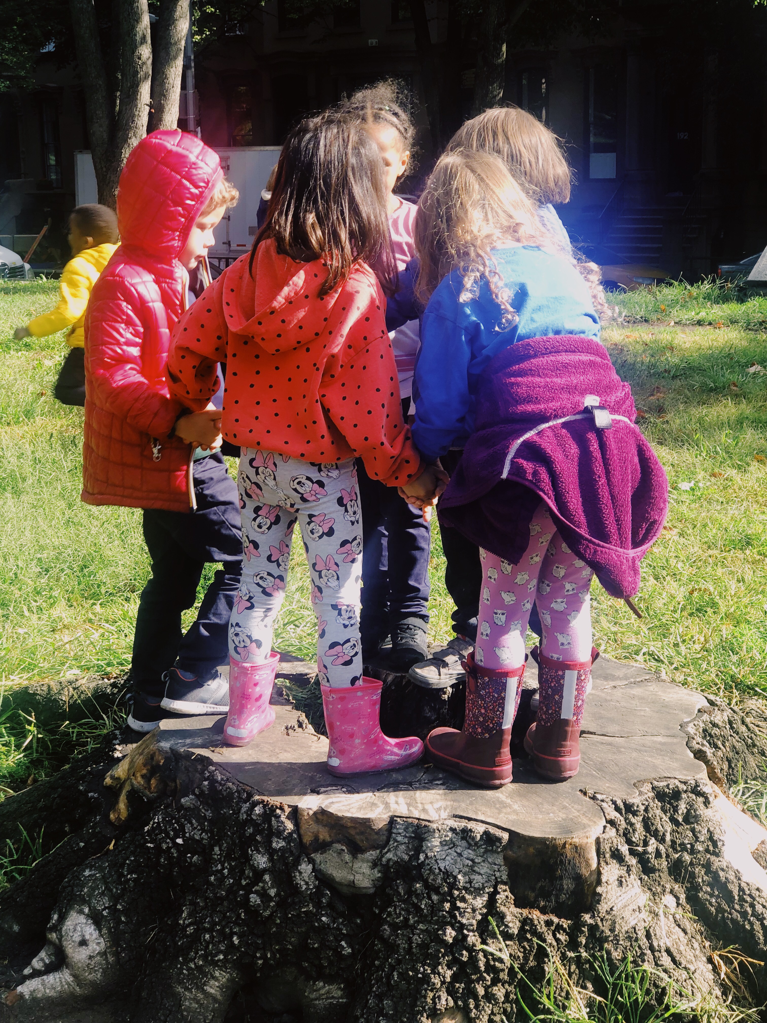 We regroup and march up to the park rangers’ station. Some children are shouting at the park rangers: “Why did you cut down the beech tree?! Why?! That’s so mean!” Other children are clinging to each other, sobbing inconsolably. Some children are stunned into silence. Madeleine and Rasha try to calm them enough to hear the rangers explain that the tree was sick, hollow on the inside, unsafe. The children aren’t ready to hear any of these logical explanations. They just want their tree back.