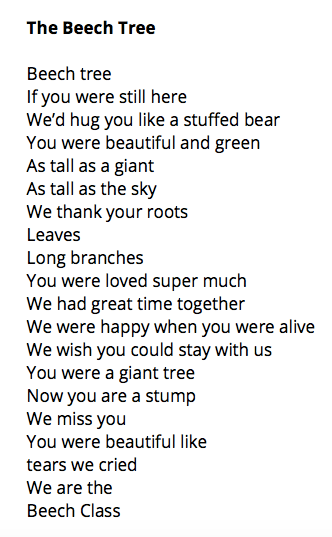 Though the experience that the Beech Class encountered is highly unique, enduring difficult moments — as an educator, student, or community — is not. Perhaps a class pet has died, a beloved student has moved away, or a natural disaster has affected the community. Maybe a child has been separated from a loved one, has become homeless, or has witnessed or experienced violence. Students are bound to encounter hard times in a school year. Whether those big moments are experienced by individual students or shared, like the loss of the beech tree, we can guide children with navigating their reactions and responses through writing.