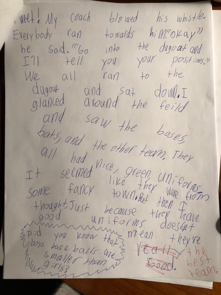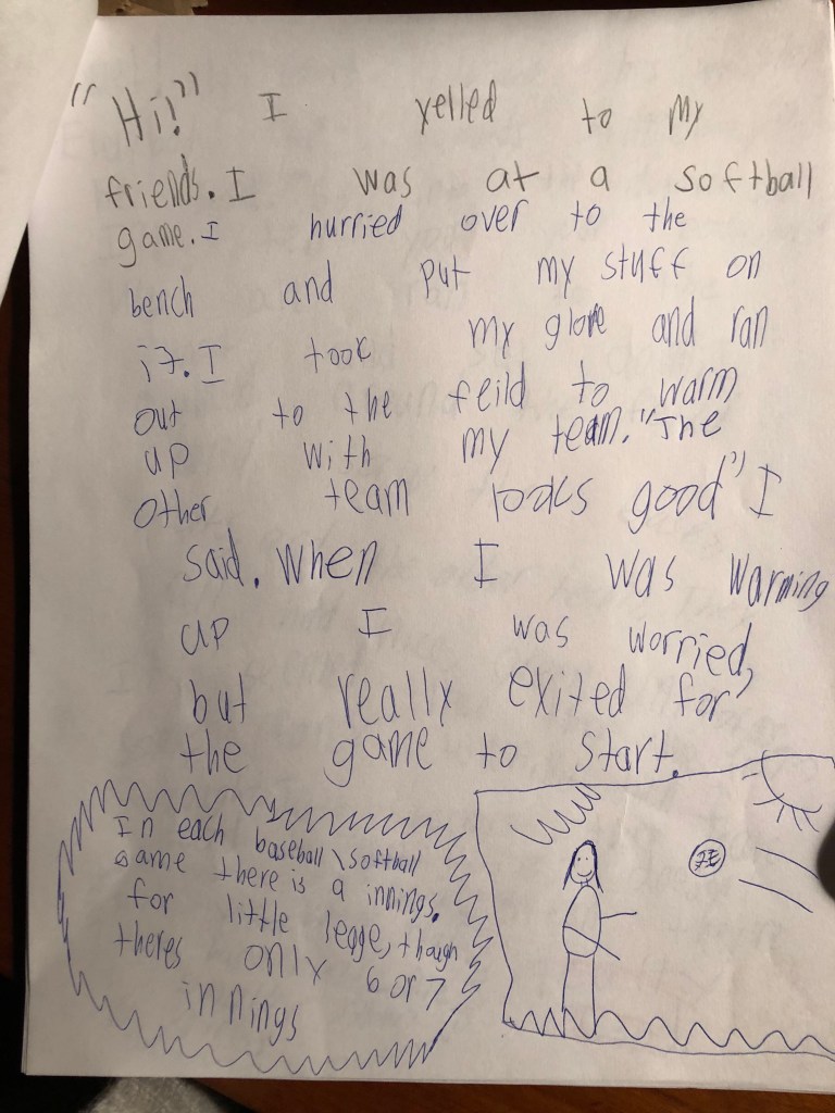 While I love stories in opinion/argument writing, one of my favorite things to teach students involves the power of story when they are writing information texts. Just the other day, a third-grade student wanted to write an informational book about softball, and we showed her Karen Wallace’s book, Giant Gentle Octopus. That book is written almost as a short story with intermittent facts. With very little additional instruction, Kyla wrote a small moment story about being up at bat, but figured out how to embed facts throughout her piece.