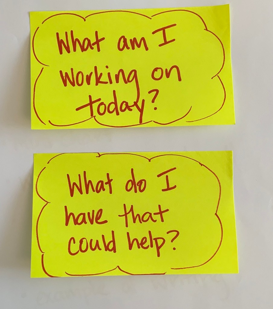 The missing piece to the cycle above is interdependence, the reliance on something besides the teacher for motivation and next steps. We show and give students many cueing systems: anchor charts, checklists, mentor texts, mini-charts, word lists, alphabet charts, etc., yet they are not using these tools when they could help most. Teaching students to ask themselves, “What am I working on?” and “What do I have that could help?” will help them learn the power of being interdependent with one of many silent teachers provided.