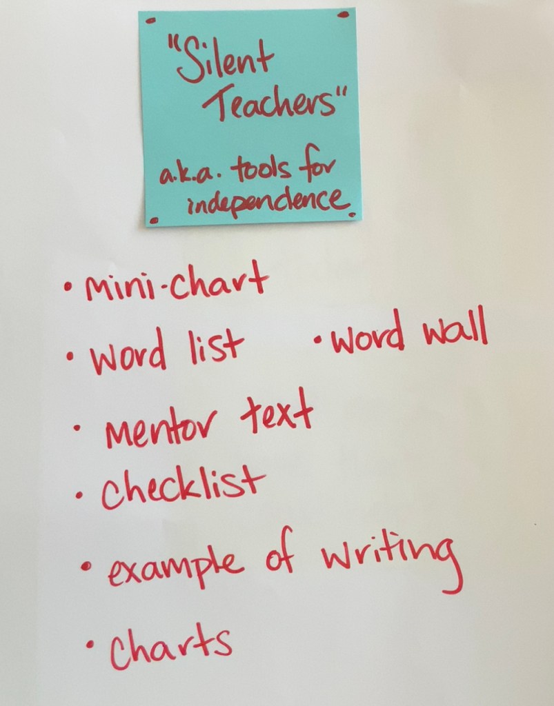 You might start by having students generate a list of all the things in the classroom that help them write, besides an adult. Have writers look around the classroom, open folders, talk to partners, etc. As students are talking, you can chart responses. Each time I’ve done this, students have been shocked at the endless supply of support shoved in their writing folder and posted around the room. The student-generated chart of silent teachers will be a nice reminder when asking themselves, “What am I working on?” and “What do I have that could help?” and a way for you to silently redirect them when they start to swarm.