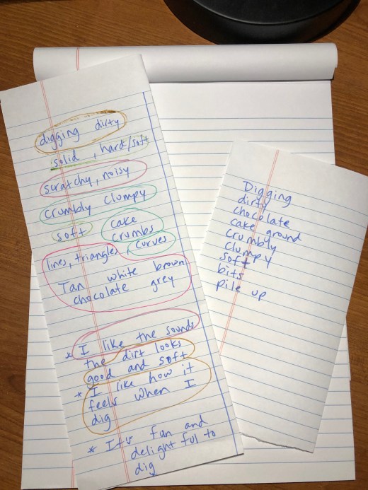 Below is an image of the list of words I was able to gather after collecting observations and responding to my thinking. I’ve also included my three tries using my experience, digging in the dirt, as inspiration for writing.