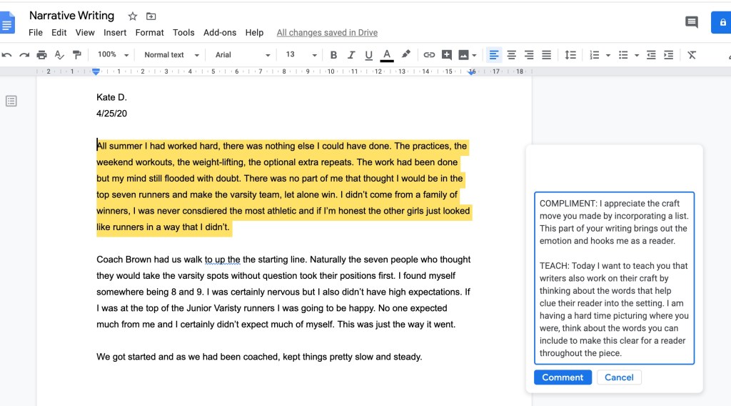 I’m stating the obvious when I say that we can’t do it all, especially right now. Many of us are feeling self-inflicted pressure to look at every word students write and are overwhelmed not just by the teaching, but by the amount of feedback we are giving day in and day out. Let’s keep in mind what we value in a traditional writing conference and remind ourselves of John Hattie’s work in Visible Learning, the notion that naming what one is already doing and giving a next step is considered effective feedback. When looking at a piece of student work give yourself permission to not say everything, stick to naming (or typing) a compliment and teach at the top of their work.